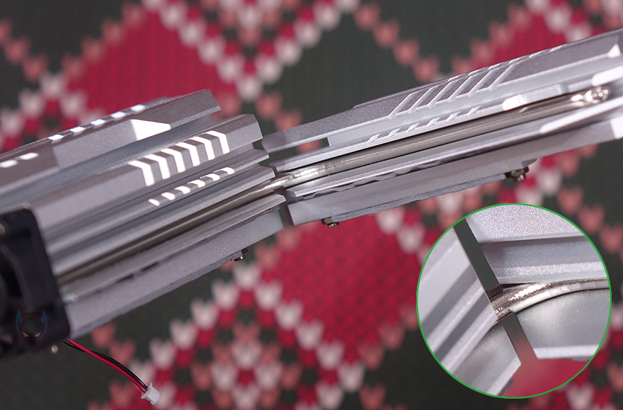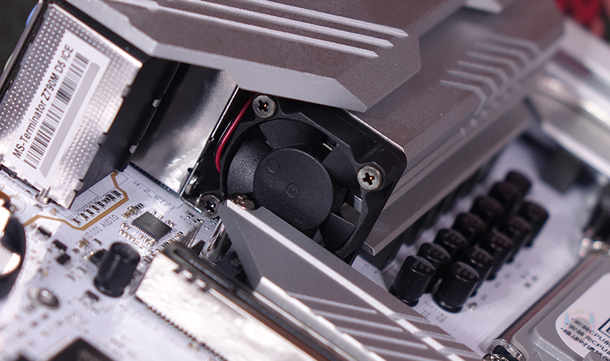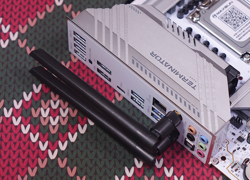 CPU 전원부에는 실버(Silver) 색상의 방열판(Heatsink)가 기본 장착되어 있으며, 한쪽에 'TERMINATOR' 모델명도 새겨놨죠. 또한, 방열판 아래쪽 측면에서 보면 30mm 팬(FAN)까지 적용된 것을 확인할 수 있습니다. 방열판으로 발열해결이 부족할 수 있는 부분을 팬까지 적용해 확실히 신속하게 빠져나갈 수 있도록 했죠. 방열판을 제거해 보면 안쪽에 기본 써멀패드가 부착된 것을 확인할 수 있으며, 2개의 방열판 사이로는 히트파이프(Heatpipe)까지 적용된 것을 확인할 수 있습니다. 그리고, 전원부는 8+1+1 페이즈(Phase)로 총 10-페이즈 구성을 하고 있으며, 개당 50A 전력공급을 담당하는 Vishay사의 Dr.MOS 모스펫과 Richtek의 RT3628AE 컨트롤칩셋으로 디지털 전원부를 갖추고 있습니다. 조금 흥미로운 점은 우리가 흔히 알고 있는 4대 메이저 메인보드 브랜드들도 전원부 칩셋 공개는 제품 페이지에서 상세하게 공개 안 하는데, MAXSUN은 이런 부분까지 상세히 공개하고 있죠. 그리고, 백패널 I/O 포트들의 커버들도 스테인리스 스틸(stainless steel)을 적용했으며, ESD 정전기 방지 기술도 적용되어 있습니다.