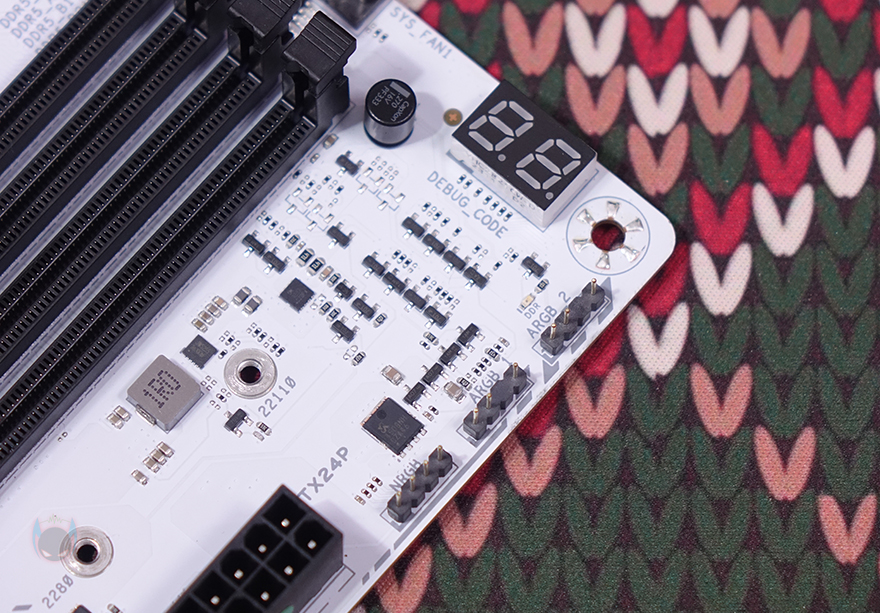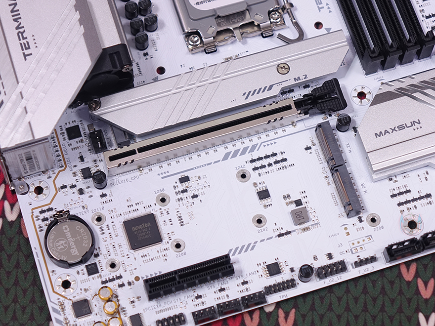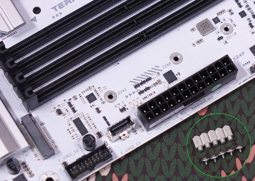 메모리(RAM) 슬롯 같은경우에는 총 4개 슬롯 구성으로 DDR5 규격을 지원하며, 개봉 시에는 기본 장착 슬롯 표기를 알려주는 스티커가 부착되어 있습니다. 또한, 슬롯 한쪽은 자동으로 고정되는 Q-DIMM 방식을 적용하고 있죠. 메모리 클럭은 7600MHz이상 지원하며, 논-바이너리 메모리까지 지원해서 최대 192GB 용량까지 장착할 수 있습니다. 그리고, 슬롯 주변에는 작동 상태를 확인할 수 있는 디버그(Debug) LED가 적용되어 있으며, 바로 옆에 5V ARGB 헤더 2개와 12V RGB 헤더 1개도 배치되어 있죠. 그리고, 또 하나 눈에 띄는 점은 슬롯 앞부분에 M.2 SSD 슬롯이 하나 배치되어 있습니다. 2242/2280/22110 사이즈까지 장착할 수 있으며, PCIe 4.0x4 규격을 지원합니다. 또한, 그 앞에 앞서 주요 특징에서 확인한 전면 USB 3.2 Gen2x2 헤더도 배치되어 있죠. 참고로, TERMINATOR Z790M D5 ICE 메인보드의 M.2 SSD 슬롯은 메인 1번을 제외하고 나머지 슬롯에 장착을 위해 제공되는 볼트와 나사를 사용자가 장착해야 합니다.
