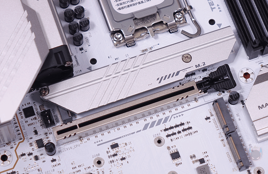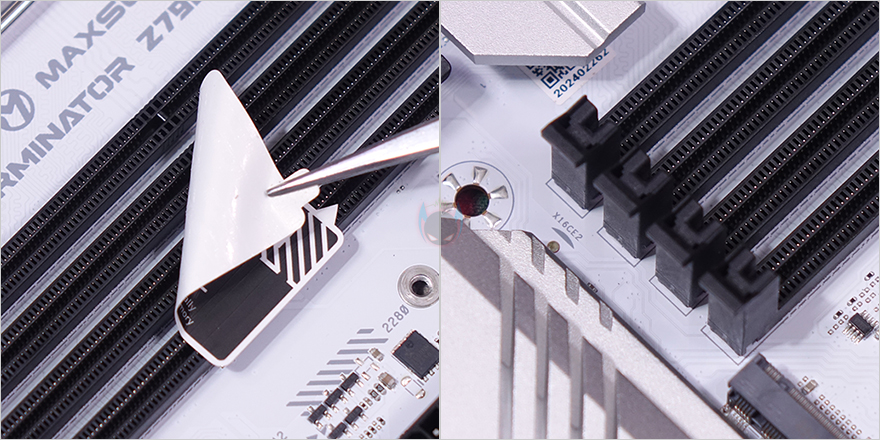 TERMINATOR Z790M D5 ICE 메인보드의 PCIE 슬롯은 총 2개 구성이며, 그래픽카드(VGA)가 장착되는 1번 슬롯은 x16배속과 함께 내구성을 위해 스틸 아머(Steel Armor) 디자인이 적용되어 있습니다. 참고로 나머지 PCIE 슬롯은 x4배속입니다. 그리고, 1번 슬롯 바로 위에는 M.2 SSD 메인 슬롯(A Slot)이 배치되어 있는데, 기본 방열판(Heatsink)이 장착되어 있으며, 방열판을 제거하면 2242/2280 사이즈 SSD 장착 지원을 확인할 수 있습니다. 물론, 방열판 안쪽에는 기본 써멀패드(Thermal Pad)가 부착되어 있죠. 그리고, 1번 PCIE 슬롯 아래에는 2개의 M.2 SSD 슬롯이 추가로 배치되어 있는데, 2242/2280/22110 사이즈까지 장착할 수 있습니다. 또한, 바로 오른쪽에는 Z790 칩셋이 위치한 곳으로, 이 부분 역시 바로 아래에 M.2 SSD 슬롯이 배치되어 2242/2280 사이즈를 장착할 수 있죠. 그래서, 앞서 언급했듯이 TERMINATOR Z790M D5 ICE 메인보드에는 총 5개의 M.2 SSD 슬롯을 장착할 수 있습니다. 참고로 규격은 모두 PCIe 4.0x4를 지원합니다. 그리고, S-ATA 커넥터도 4개를 갖추고 있는 걸 확이할 수 있죠.