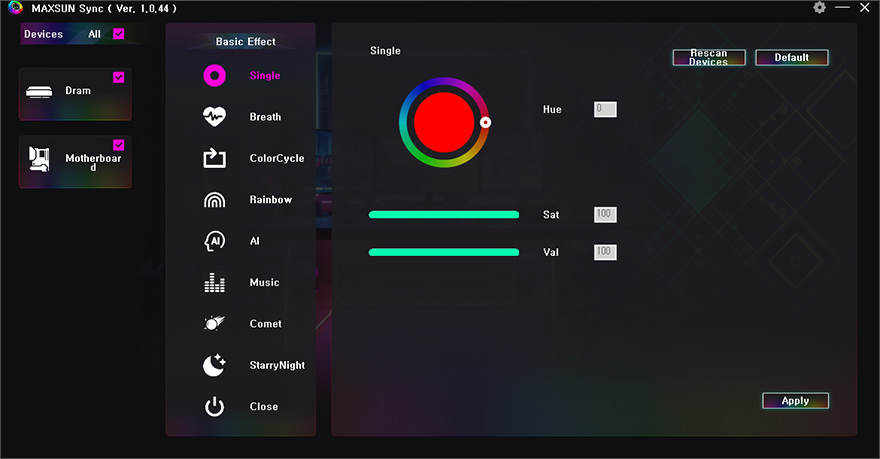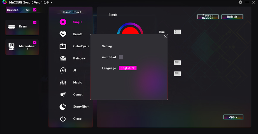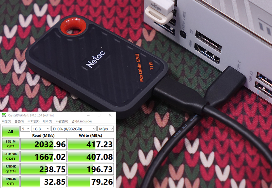 그리고, TERMINATOR Z790M D5 ICE 메인보드 전면과 후면에는 각각 USB 3.2 Gen2x2 Type-C 포트로 지원해주고 있어서, 실제 USB 3.2 Gen2x2 외장 SSD(External SSD)를 사용해 속도 확인을 해봤는데, USB 3.2 Gen2x2 규격으로 나올 수 있는 최대 2000MB/s 속도를 확인할 수 있습니다. 끝으로, 앞서 TERMINATOR Z790M D5 ICE 메인보드 후면에는 RGB 라이트효과를 볼 수 있는 LED가 적용되어 있는 걸 확인했습니다. 그래서, RGB 라이트효과를 보기 원한다면, MAXSUN(맥선)에서 제공하는 RGB 프로그램을 설치하면 되는데, 아직 글로벌 홈페이지에선 다운로드할 수 없고, 중국 홈페이지에서 다운로드 받을 수 있습니다. RGB 프로그램을 실행해 보면, 총 9가지 RGB 모드가 지원되는 걸 확인할 수 있고, RGB 프로그램이 실행되어야만 메인보드 후면 RGB LED가 작동하기 때문에, 사용하길 원한다면 운영체제 부팅 시 자동실행이 되도록 설정해 놓으면 됩니다.