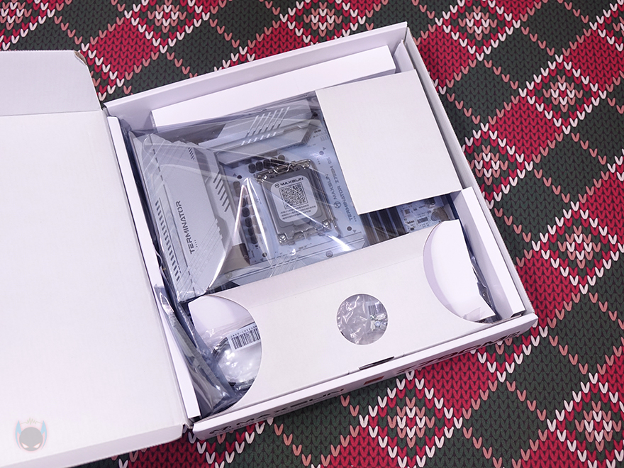 박스를 열어보면, 메인보드는 정전기 방지 보호비닐에 포장된 것을 확인할 수 있으며, 전체 제품 구성은 TERMINATOR Z790M D5 ICE 메인보드, SATA 케이블 2개, Wi-Fi 안테나, M.2 SSD 나사 및 볼트, 제품 보증서로 이루어져 있습니다. 앞서 언급한 대로, 제품 설명서는 QR코드로 제공되기 때문에 인쇄물로는 없습니다.