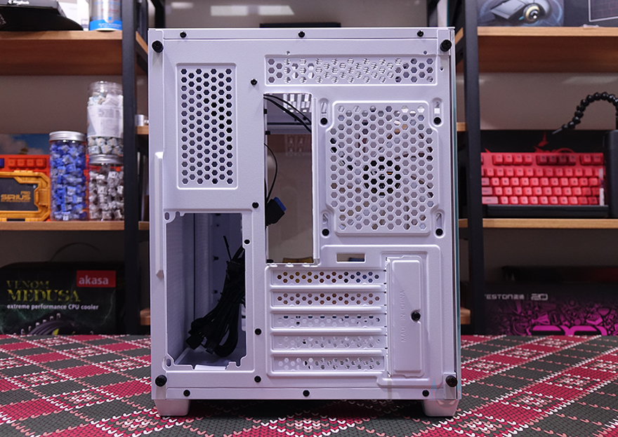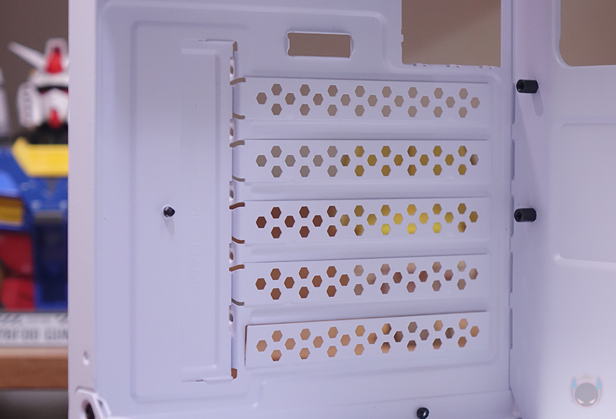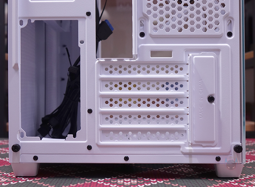 케이스 후면을 살펴보면, 파노라마-뷰 케이스 그러니깐 어항케이스에서 많이 볼 수 있는 내부 구조를 미리 간접적으로 파악할 수 있습니다. 메인보드와 그래픽카드는 전면 기준 오른쪽 공간에, 저장장치와 파워서플라이는 왼쪽 공간에 장착되는 일종의 듀얼 챔버 타입이죠. 좀 더 자세히 살펴보면, 후면 배기역할의 에어홀 처리와 함께 내부에는 120mm 팬이 기본 장착된 것을 간접적으로 확인할 수 있으며, 뒤에서 다시 확인하겠지만 같은위치 오른쪽 공간에 저장장치가 장착됩니다. 그리고, 아래에는 미니타워 기준인 PCI 슬롯가이드 4개보다 1개 더 많은 5개를 갖추고 있으며, 역시 같은 위치에서 오른쪽 공간에 파워서플라이가 세로방향으로 장착되죠.