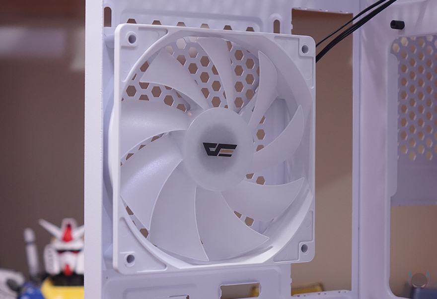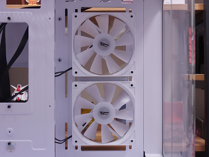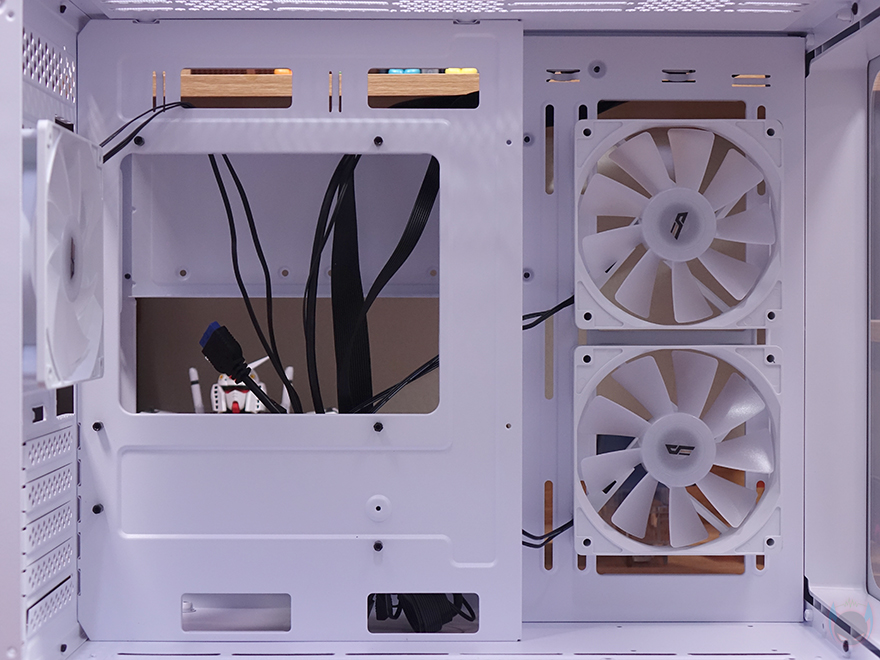 그리고, 내부 후면에는 앞서 외부에서 잠깐 확인했던 배기역할의 120mm 팬을 확인할 수 있는데, 역시 다크플래쉬의 C7A 팬 모델이며, ARGB 팬입니다. 또한, 아래에 PCI슬롯 가이드는 모두 일회용으로 적용되었으며, 내부 하단에는 앞서 언급했듯이 하단 쿨링시스템을 갖출 시 팬 기준 120mm 팬 3개를 장착할 수 있으며, 수랭쿨러시에는 360mm 라디에이터까지 장착이 가능합니다. 또한, 앞자리 일부에는 저장장치도 장착할 수 있는데, 2.5인치 HDD/SSD 또는 3.5인치 HDD를 장착할 수 있죠.