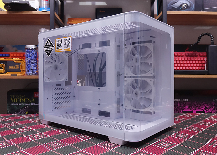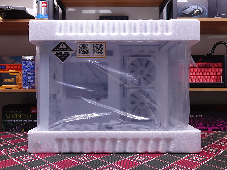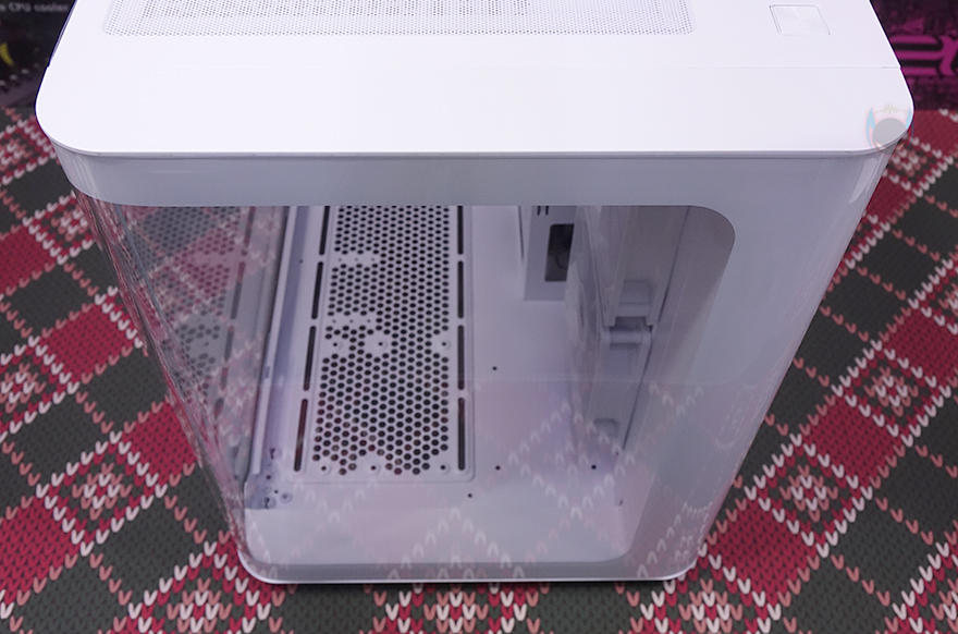 본격적으로 다크플래쉬 DPW90M PC케이스를 살펴보면, 시작에서 잠깐 언급했듯이 지난달에 미들타워 버전의 DPW90이 먼저 출시되었기 때문에, 이에 맞춰 미니타워 버전인 DPW90M 역시 색상은 화이트와 블랙 2가지 색상으로 출시되었습니다. 그리고, 역시 가장 눈길을 끄는 부분은 강화유리 부분으로 특히 전면 강화유리가 곡면 커브드로 적용되었죠. 물론, 개봉 시에는 보호비닐이 부착되어 있기 때문에 사용 전에 제거해야 합니다. 또한, 전면 강화유리 같은 경우 측면 사이드 패널까지 연결되는 경계 부분까지 양쪽 다 곡면 커브드 디자인으로 적용했습니다.