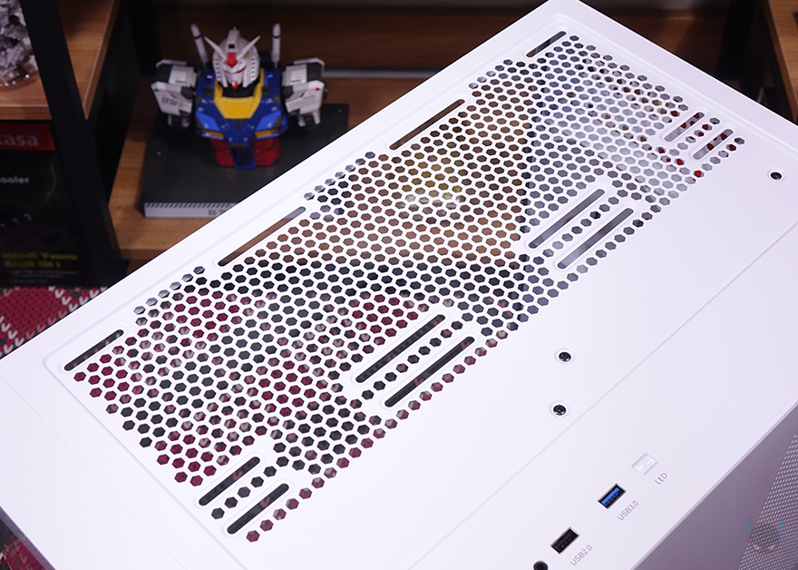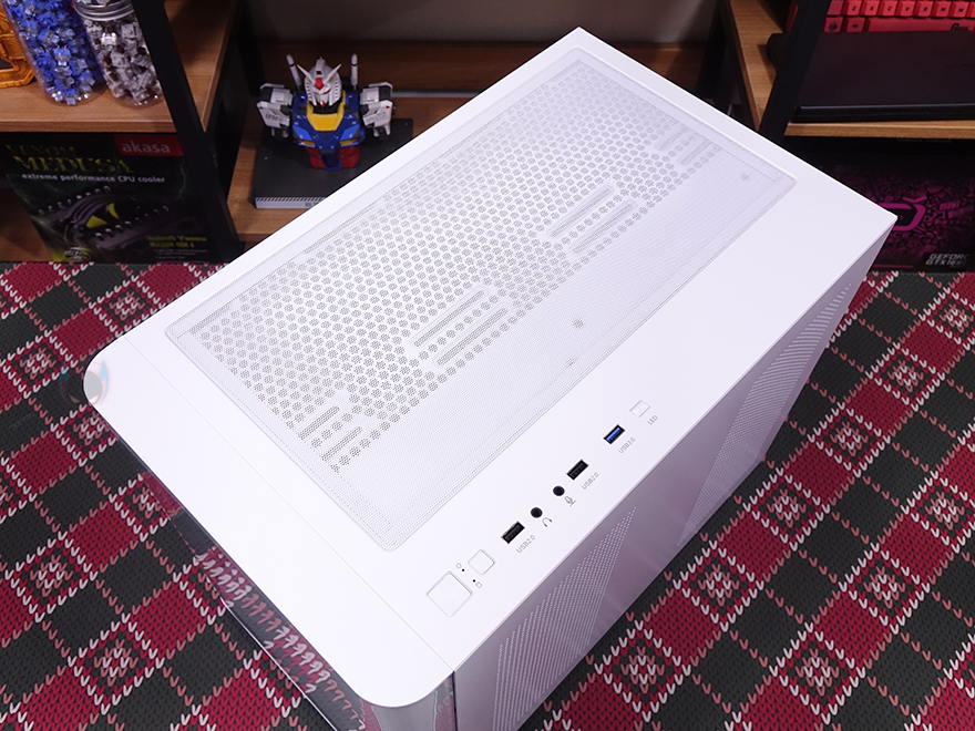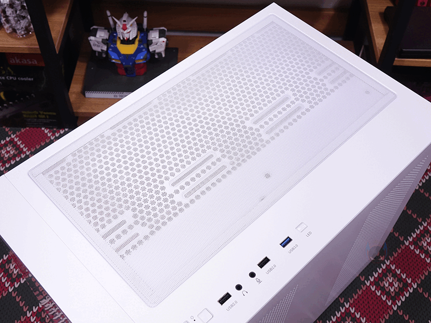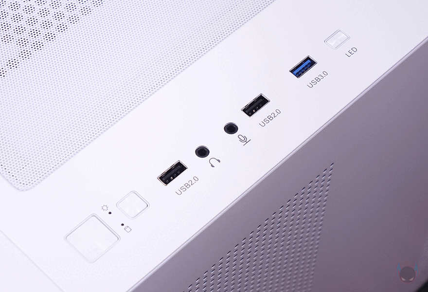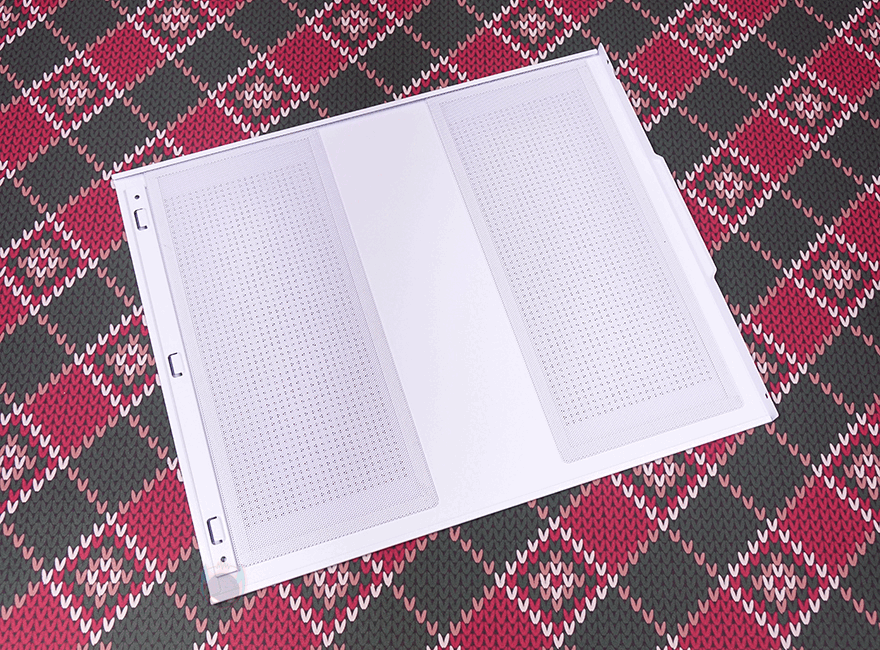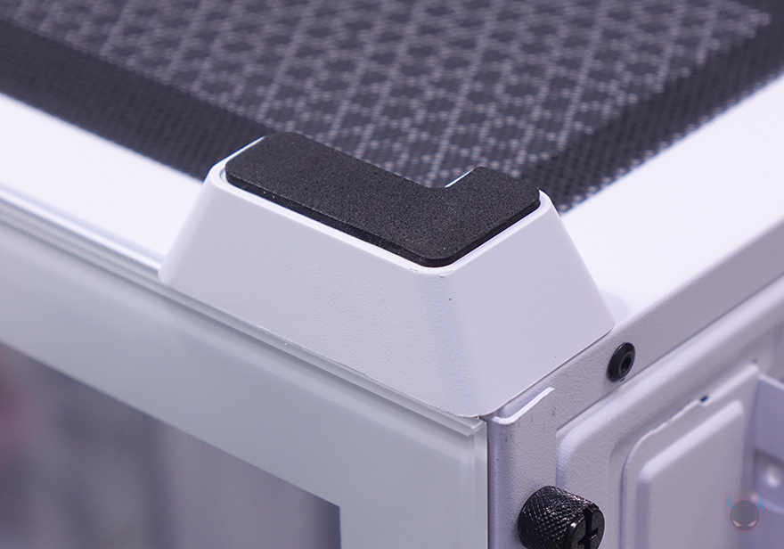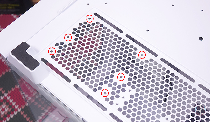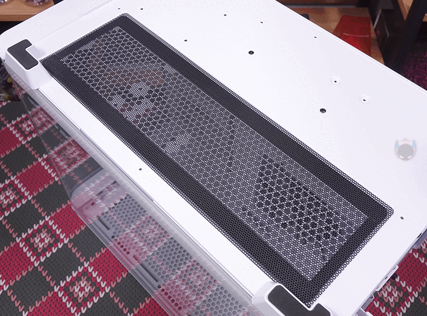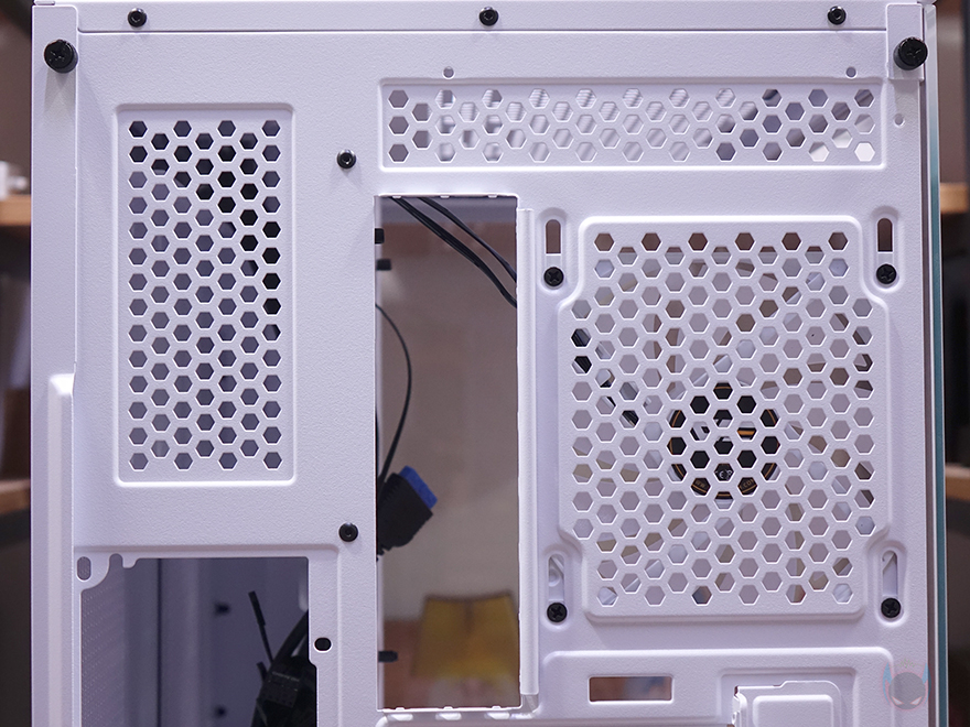 DPW90M 케이스 상단에는 맨 오른쪽 앞부분에 버튼 및 포트가 배치되어 있는데, 전원버튼, 리셋 버튼, USB 2.0 포트, 헤드셋/오디오 포트, USB 2.0 포트, USB 3.0 포트, LED 버튼 순으로 배치되어 있습니다. 앞서 구성품에서 확인했듯이 USB 포트를 사용하지 않을 때는 먼지 유입 및 부식방지를 위해 제공되는 포트 마개를 사용하면 됩니다. 참고로, LED 버튼은 메인보드에 연결하는 게 아니라 별도로 판매되는 허브장치에 연결됩니다. 그리고, 나머지 상단 패널 영역은 자석 방식의 먼지 필터가 부착되어 있으며, 필터를 분리하면 상단 쿨링시스템을 갖출 수 있게 에어홀 처리와 함께 나사홀이 처리된 것을 확인할 수 있죠. 상단에는 팬 기준 120mm 팬 3개 또는 140mm 팬 2개를 장착할 수 있으며, 수랭쿨러 사용 시에는 최대 360mm 라디에이터까지 장착할 수 있습니다.