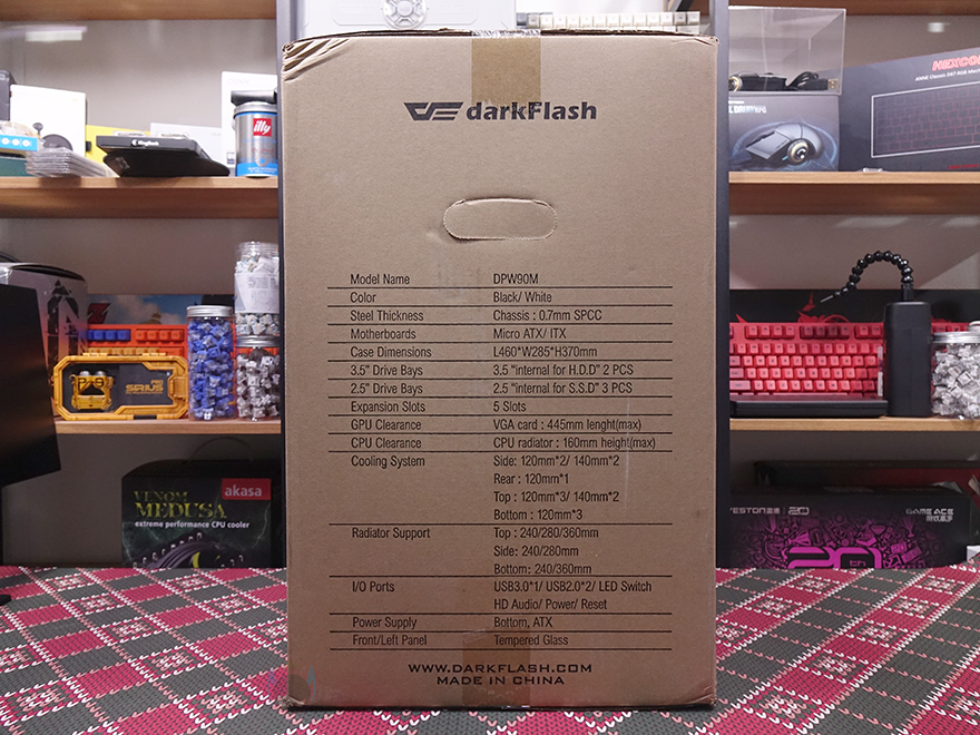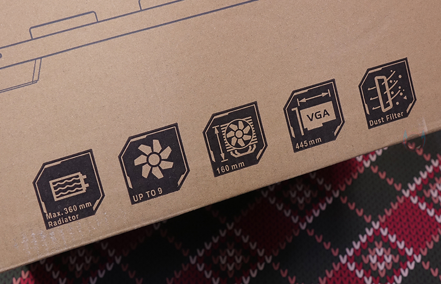 제품 박스부터 살펴보면, 전후면에는 각각 제품 이미지를 담으면서 모델명을 표기해놨는데, 모델명 아래에도 커브드 강화유리 PC케이스라는 문구를 담고 있습니다. 그리고, 아래에는 제품의 주요 특징을 아이콘형식으로 표기해 놨는데, 라디에이터 길이 지원, 총 장착할 수 있는 팬 개수, 쿨러 높이, 그래픽카드 길이, 먼지 필터를 언급하고 있죠. 박스 한쪽 측면에는 좀 더 자세하게 주요 특징을 표기해 놨는데, 추가로 USB 포트 지원과 기본 팬 지원을 확인할 수 있습니다. 그리고, 반대쪽 측면에는 제품의 기본사양을 상세하게 표기해 놔서, 오프라인 매장에서 구매할 때도 충분히 제품 정보를 얻을 수 있습니다.