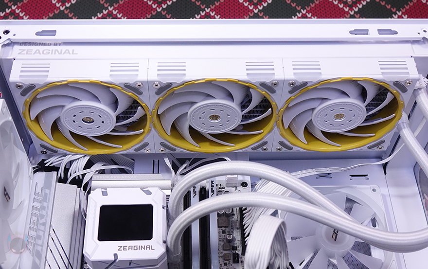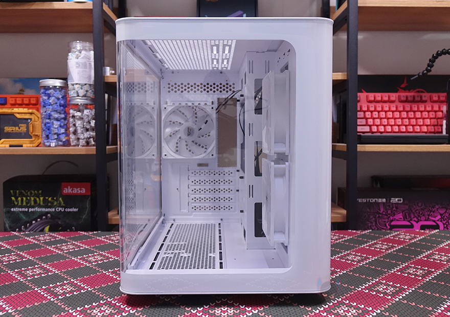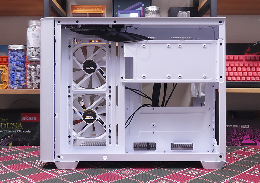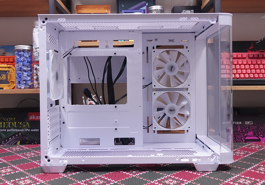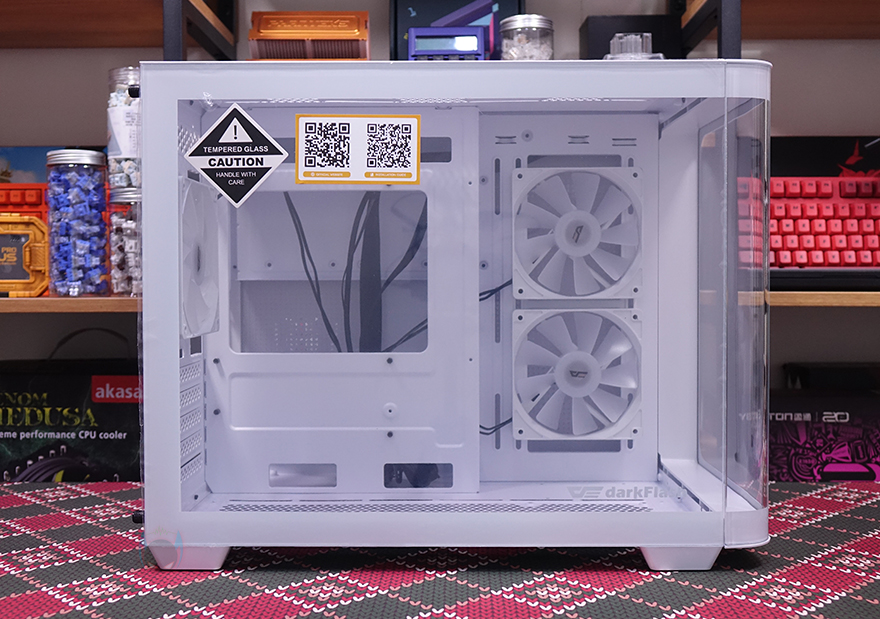 이제, 다크플래쉬 DPW90M 미니타워 PC케이스의 내부를 살펴보는데, 어항케이스답게 내부 구조는 간단합니다. 일단 메인보드가 장착되는 트레이 부분에는 CPU-컷-아웃을 비롯해 주변으로 케이블 정리를 할 수 있는 선정리-홀이 처리되어 있으며, 트레이 앞부분 측면에는 측면 쿨링시스템으로 120mm 팬이 기본 장착된 것을 확인할 수 있습니다. 어항케이스 특성상 측면 쿨링시스템은 기본 외부공기를 흡입하는 역할이기 때문에 기본 장착된 120mm 팬 모두 다크플래쉬의 C7RA 리버스팬이 적용되었죠. 물론, ARGB 팬입니다. 참고로, 기본 팬을 제거하고 140mm 팬도 최대 2개까지 장착할 수 있으며, 수랭쿨러시에는 280mm 라디에이터까지도 장착이 가능합니다.