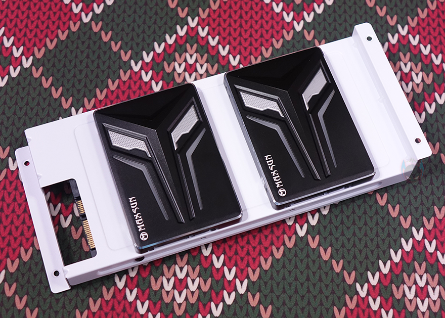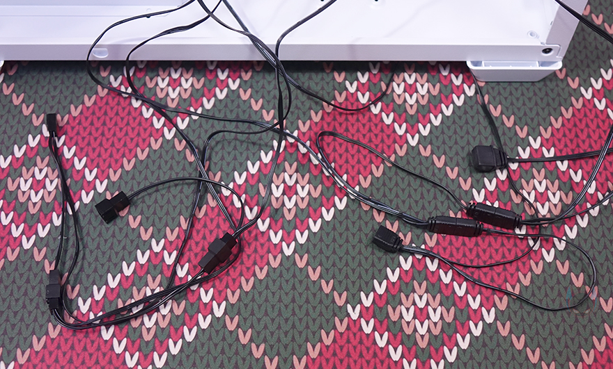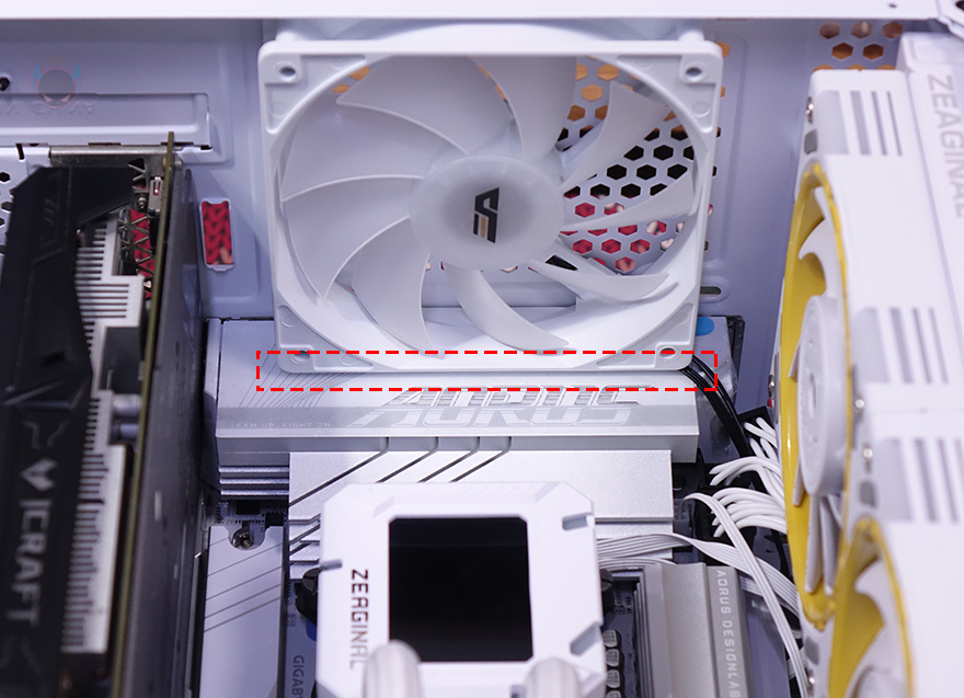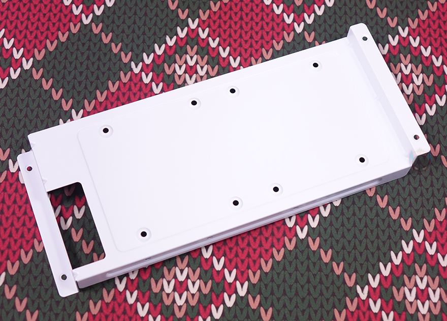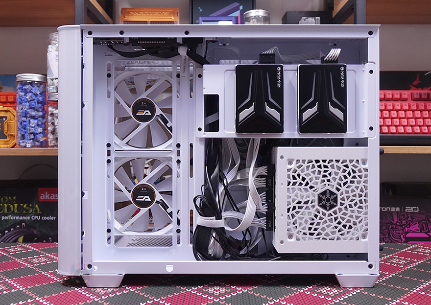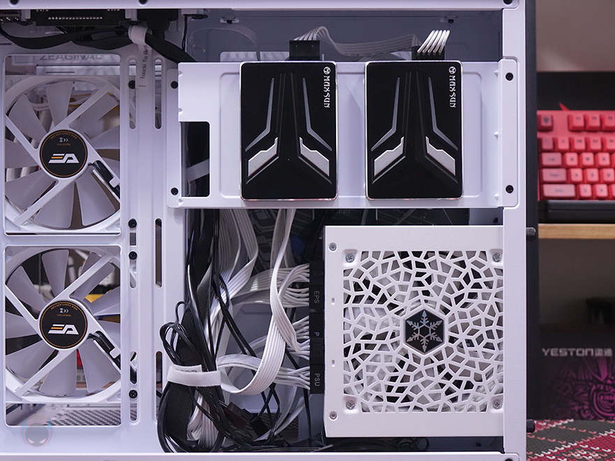 이번엔 내부 후면 그러니깐 메인보드 트레이 뒷면을 살펴보면, 앞서 언급했듯이 윗부분에는 저장장치가 장착되는 공간으로 저장장치를 장착할 수 있는 브라켓이 장착되어 있습니다. 고정된 나사 4개를 풀면, 쉽게 분리가 되고, 브라켓 바깥쪽에 2.5인치 HDD/SSD 2개를 장착할 수 있고, 브라켓 안쪽에 3.5인치 HDD 1개를 장착할 수 있죠. 그리고, 바로 아래 공간에는 파워서플라이 자리로 세로방향으로 장착할 수 있으며, 받침대도 적용되어 있습니다. 끝으로, 기본 제공되는 팬 3개는 모두 서로 연결할 수 있는 연장선을 갖추고 있어서, 팬 작동 케이블과 RGB 케이블끼리 서로 연결한 후 최종적으로 메인보드에 연결시켜 주면 됩니다.