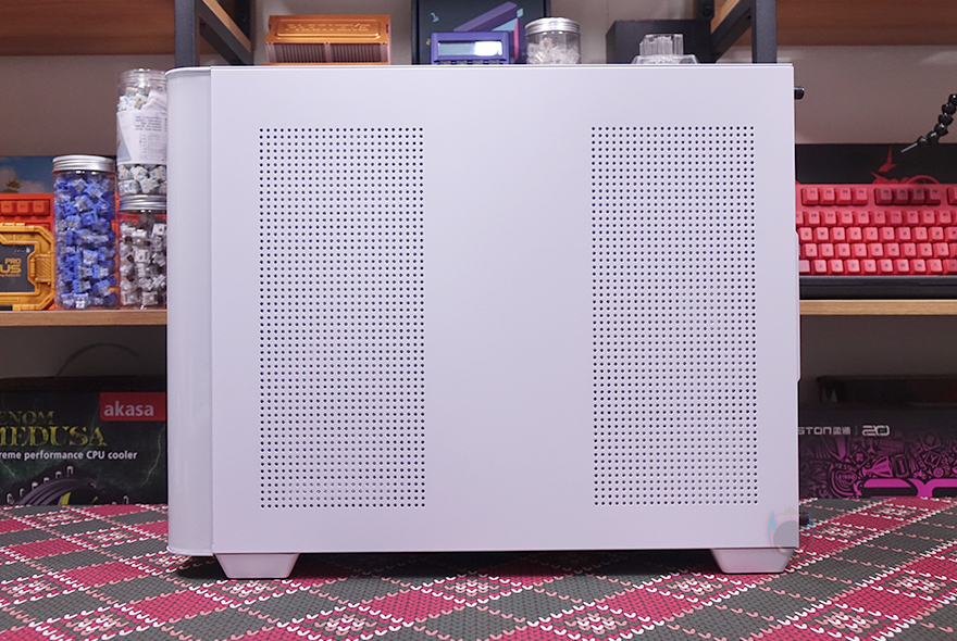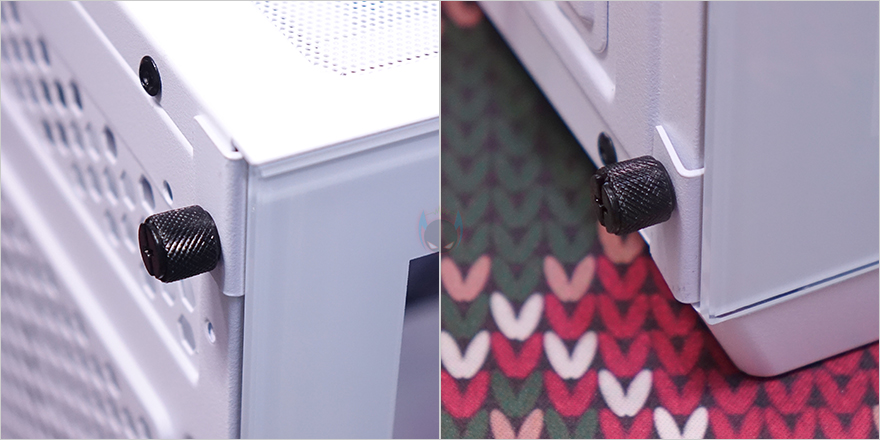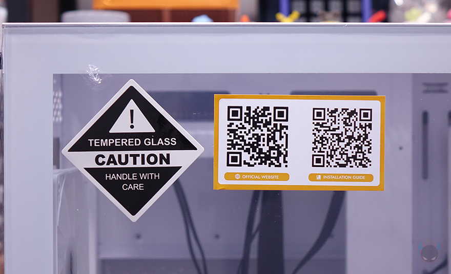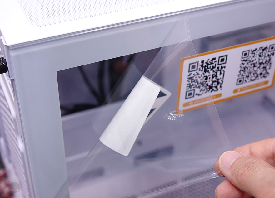 사이드 패널 같은경우에는 전면 기준 왼쪽 패널은 강화유리로 방금 확인했던 전면 강화유리와 같은 베젤라인으로 처리해 통일감을 주고 있으며, 구성품에서 잠깐 언급했듯이 제품설명서는 QR코드로 제공해주는데 강화유리 오른쪽 윗부분에 배치된 것을 확인할 수 있습니다. 물론, 왼쪽 패널 강화유리 역시 보호보닐이 부착되어 있어서, 사용 전에 제거를 해야 합니다. 그리고, 패널 고정은 후면 위아래 핸드-스크류를 사용했으며, 패널은 분리해 안쪽을 보면 위아래 앞부분에 걸쇠 장치도 적용된 것을 확인할 수 있죠. 오른쪽 패널 같은 경우에는 어항케이스 특성상 전면 쿨링이 어렵기 때문에 측면 쿨링으로 대처하는 점을 그대로 반영에 샤시에 에어홀 처리를 해놨으며, 패널 안쪽에는 자석방식의 먼지 필터도 기본 장착되어 있습니다.