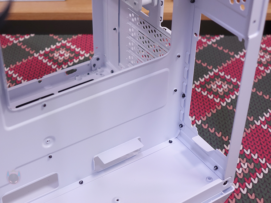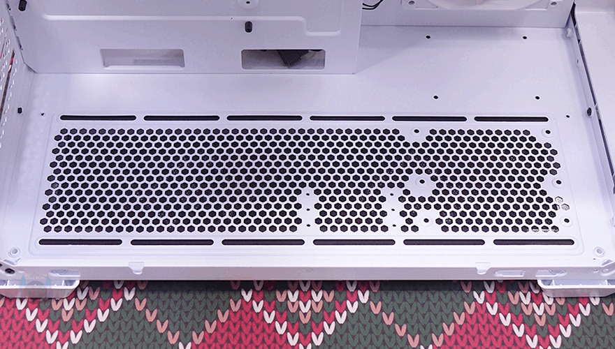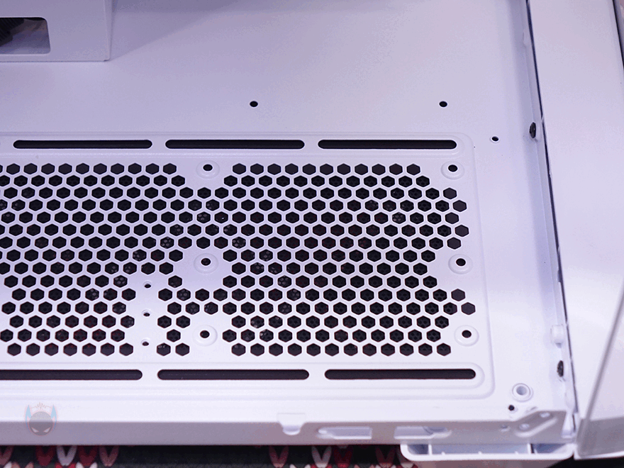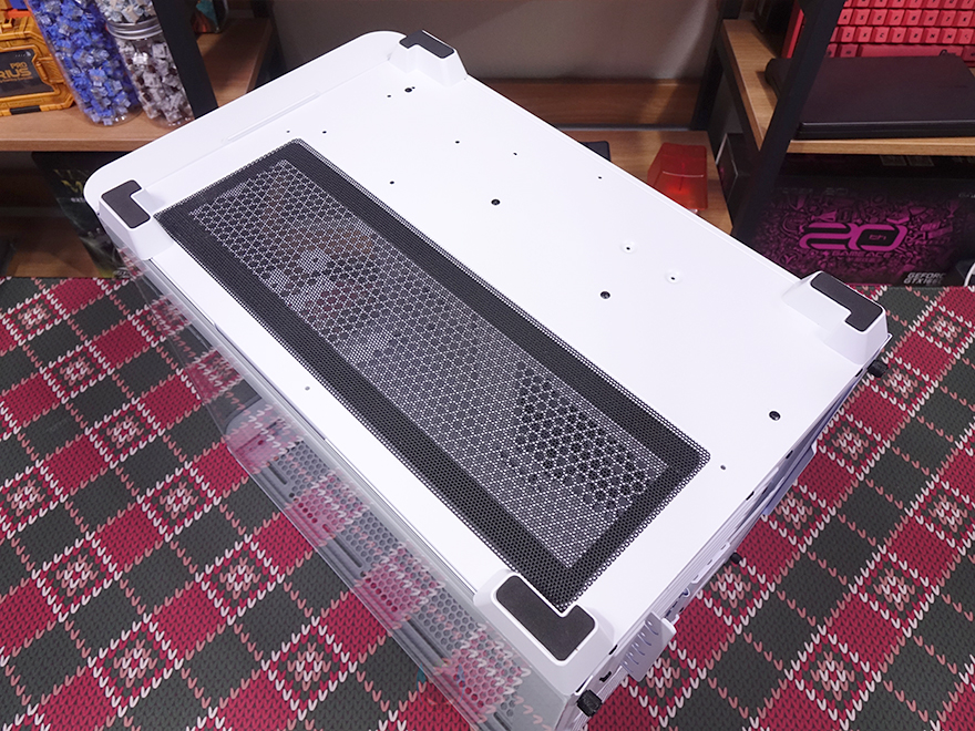 DPW90M 케이스 외형 끝으로 케이스 밑바닥 부분을 살펴보면, 모서리 부근의 받침대에는 모두 기본 패드가 부착되어 있으며, 한쪽 라인으로는 자석방식의 먼지 필터가 장착된 것을 확인할 수 있는데, 내부 기준에서 메인보드와 그래픽카드가 장착되는 공간의 밑바닥 위치입니다. 먼지 필터를 분리하면 내부에서 하단 쿨링시스템을 갖출 수 있게 에어홀 처리와 나사홀 처리를 확인할 수 있으며, 뒤에서 확인하겠지만, 앞자리에는 저장장치도 장착할 수 있습니다.