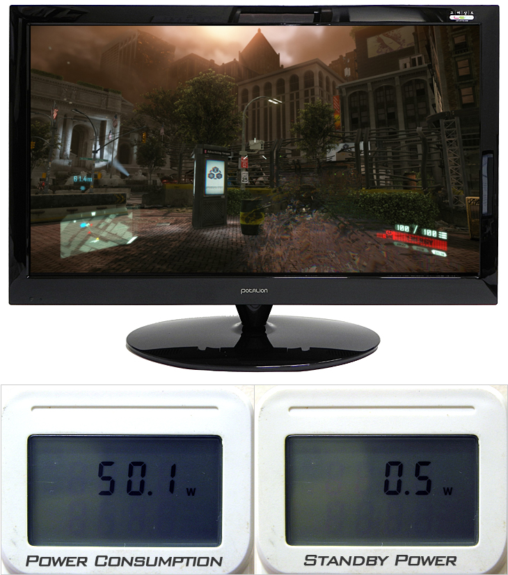 이번에 시야각을 확인해보자. 이번 모델은 그동안 포탈리온에서 TN패널을 적용했던 것과 달리 178°를 자랑하는 광시야각 패널 LG IPS패널을 적용했다. IPS 패널은 TN패널에 비해 좀 더 자연적인 색상을 재현해주고, 시야각 확보로 그래픽작업이나 영상 시청에 만족스러운 효과를 가져온다. 실제, 시야각을 확인해 본 결과, 어느 각도에서 보더라도 TN패널처럼 색이 어두워지는 현상 없이 색 그대로 보여주는 것을 확인할 수 있었다. 게임을 실행해 모니터의 반응속도를 체감해보자. 이번 모델은 6ms(GTG)의 응답속도를 가지고 있다. 실제, 게임속도가 있는 FPS 게임 장르를 플레이해 본 결과, 전문 프로게이머수준이 아니라면, 일반 게임 유저로썬 충분한 게임인식속도를 보여주고 있어, 응답속도는 무난한 편이라 만족스럽다 할 수 있겠다. 물론, 예민하게 반응속도를 본다면 TN패널의 모니터를 선호해야겠다. 끝으로, 제품의 소비전력과 대기전력 상태를 확인해보자. 소비전력에서 약 50W정도의 소비를 보였으며, 대기전력상태에선 1W미만의 전력소모를 보여줘서 전력효율에선 매우 만족스럽다 할 수 있겠다.