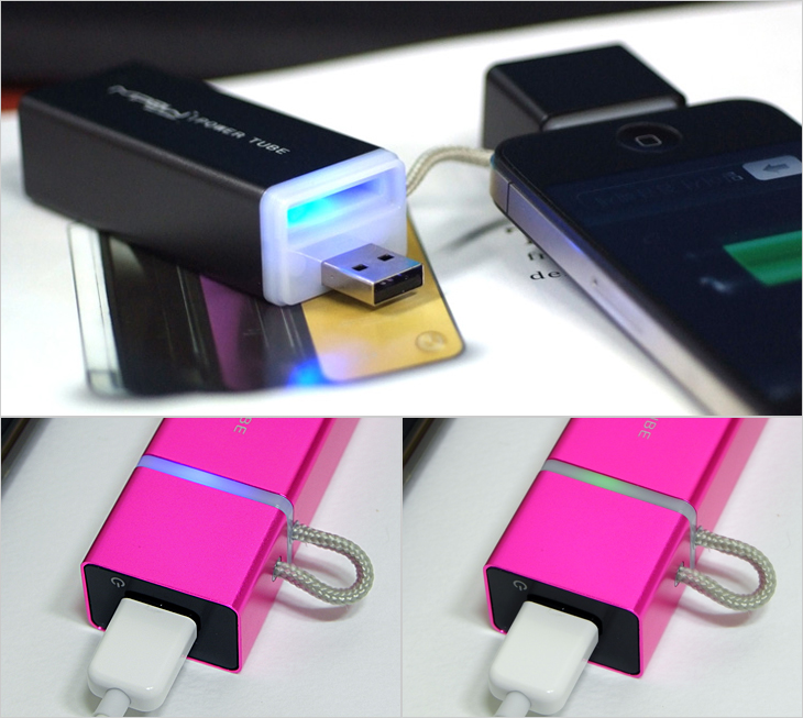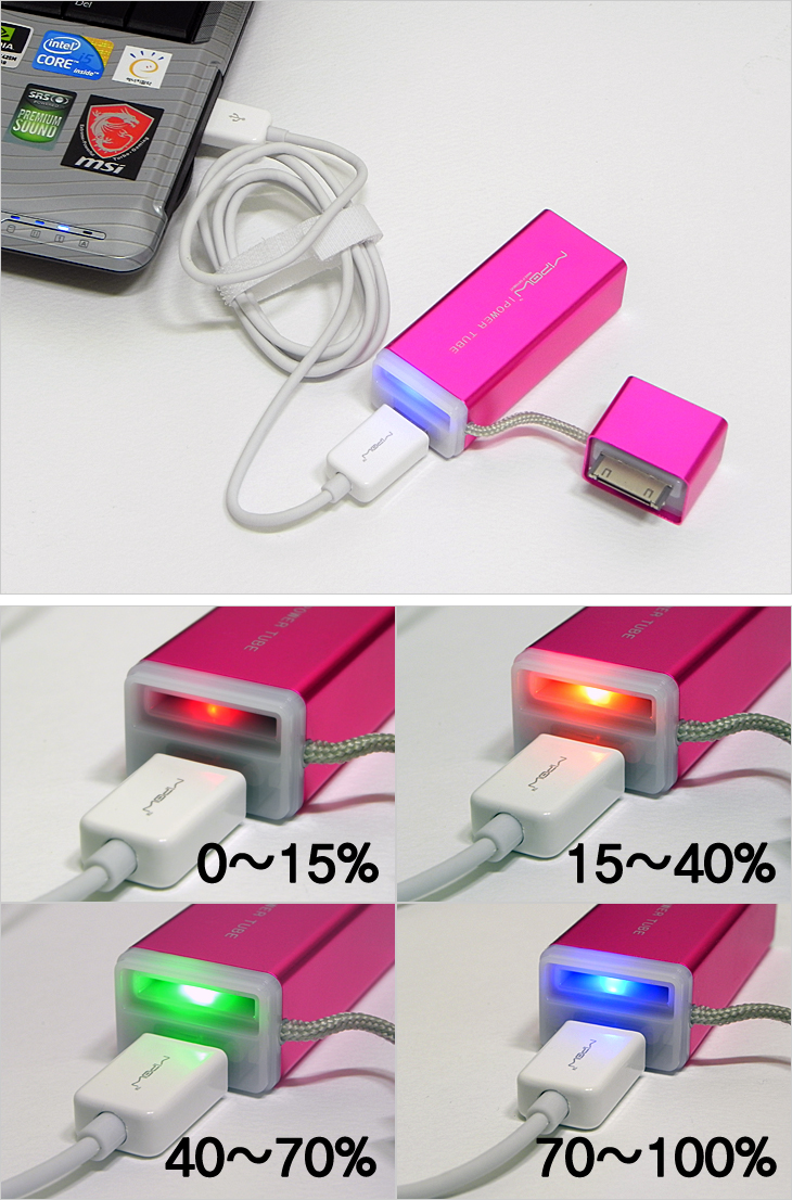 MIPOW는 애플 제품을 1차 컨셉으로 하는 브랜드로 파워튜브 역시 애플 제품과의 호환을 우선으로 한다. 하지만, 앞서도 언급했듯이 마이크로 5핀이 제공되기 때문에 애플외 타사(삼성, LG 등)의 제품과도 호환 사용이 가능해 스마트폰/타블렛PC를 충천할 수 있겠다. 또한, 파워튜브는 사용시 배터리의 잔량을 LED 인디케이터 적용으로 바로 확인할 수 있는데, 외부 USB 포트에 표기된 전원 마크를 누르면 바로 점등 표시를 통해 확인할 수 있겠다. 잔량에 따라 색깔 표기가 다른데, 70% 이상일 경우 블루, 40~70%일 경우 그린, 15~40%일 경우 오렌지, 15%미만 남았을 경우 레드로 점등 표기되겠다. 그리고, 파워튜브 배터리를 다 사용하고 나면 바로 PC와 연결해 충전을 할 수 있고, 기본 제공되는 연장 케이블을 사용해 충전할 수도 있다. 또한, 파워튜브 배터리 충전 시에도 LED 인디케이터가 자동적으로 점등 표시를 계속 보여주면서 역시 용량에 따른 색 표기를 해주겠다. 실제, 다 소모한 파워튜브를 완충하는데 용량에 따라 색이 바뀌는 것을 확인할 수 있었고, 완충하는데 약 5~6시간 소요가 되었다.