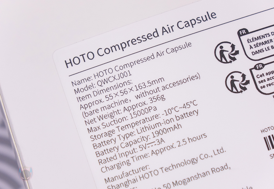 제품 박스부터 살펴보면, HOTO(호토) 제품들은 박스 디자인이 심플한걸로 유명하죠. 압축 공기 캡슐 헨드헬드 진공 청소기(Compressed Air Capsule) 역시 박스 디자인이 심플합니다. 전면에 HOTO 이름과 제품 이미지만 담고 있죠. 하지만, 제품 디자인만봐도 휴대용이라는걸 짐작할 수 있습니다. 실제로 박스 사이즈도 작은 편이죠. 그리고, 양쪽 측면에는 각각 흡입으로 사용되는 청소용 먼지통(Dust cup)과 브러시(Brush nozzle), 배출용 그러니깐 공기 주입이나 에어브러시처럼 사용할 수 있는 노즐과 공기를 빼는 진공 노즐 등 다양한 커넥터 도구 이미지를 담고 있습니다. 또한, 박스 후면에는 제품의 기본 사양을 표기해놨는데, 작은 사이즈와 높은 흡입력 표기를 확인할 수 있죠.