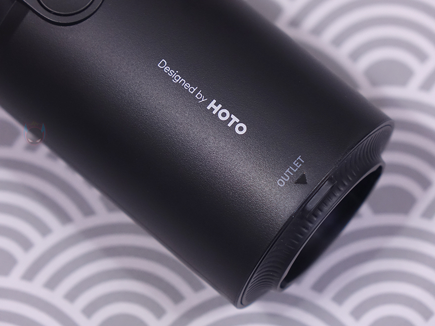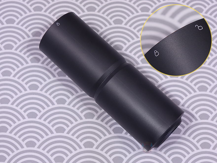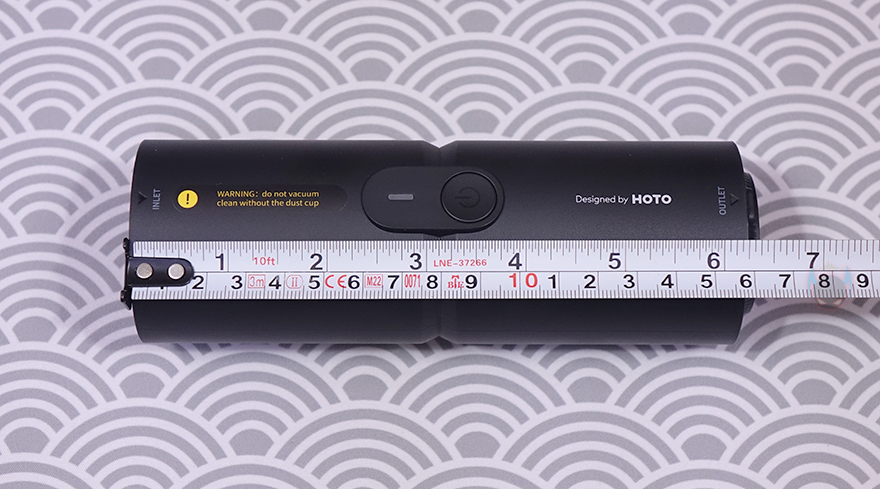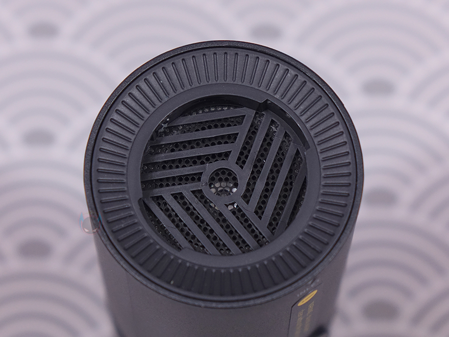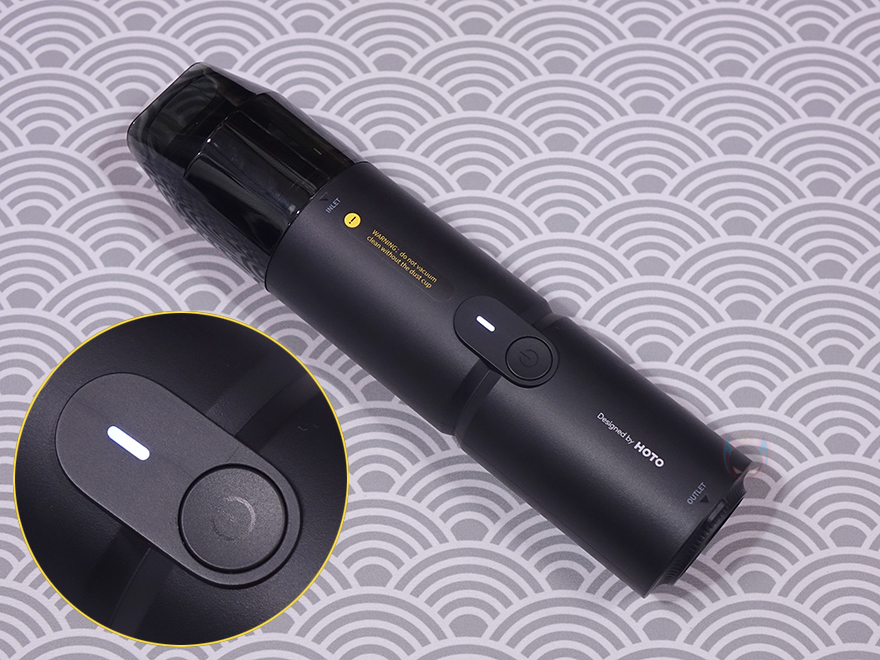 그럼, HOTO(호토)의 압축 공기 캡슐 헨드헬드 진공 청소기(Compressed Air Capsule) 본체인 바디(Body)부터 살펴보는데, 몸체 길이는 163.5mm로 앞서 잠깐 언급했듯이 휴대용으로 한손이 잡기 편한 길이를 가졌습니다. 참고로, 지름도 56mm로 한손 그립이 편한 굵기를 가졌으며, 무게는 약 361g으로 역시 휴대하기에 부담되지 않는 무게를 가졌죠. 몸체 정가운데는 전원 버튼(Power button)과 바로 위에 배터리 상태를 확인할 수 있는 LED 인디케이터(Indicator)가 적용되어 있습니다. 그리고, 이 버튼 위치를 기준으로 앞쪽으로는 청소용으로 사용되는 흡입구(Inlet)가 적용되어 있는데, 그릴 디자인에 안쪽으로 메쉬 디자인이 적용된 것을 확인할 수 있습니다.
