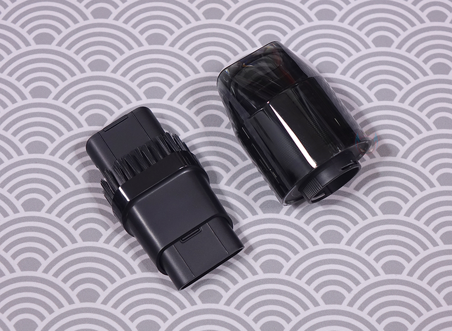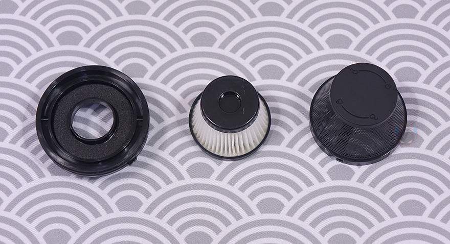 이번에 몸체에 연결되는 각 커넥터들을 살펴보는데, 먼저 청소 흡입구에 연결되는 커넥터에는 먼지통(Dust cup)과 분리형 브러시 진공 헤드(Movable brush vacuum head) 2가지 제공됩니다.물론, 먼지통에 분리형 브러시 진공 헤드를 연결해서 사용하는 것이고, 기본적으로 먼지통에도 흡입구가 있기때문에 먼지통만 연결해서 사용해도 됩니다. 먼지통 같은경우에는 정확히 용량 표기가 없지만, 대략 30~40ml 용량정도 크기이며, 내부에 헤파-필터(HEPA Filter)가 적용되어 있는데, 후면에서 안쪽으로 누르면서 표시된 잠금/풀림 방향으로 돌리면 쉽게 장착/분리할 수 있습니다. 또한, 분리된 헤파필터는 바깥쪽 메쉬(Mesh)부분이 메탈(Metal) 재질이며, 역시 안쪽에 표시된 잠금/풀림 표시대로 움직이면 메쉬 메탈부분과 헤파필터를 따로 분리할 수 있습니다.