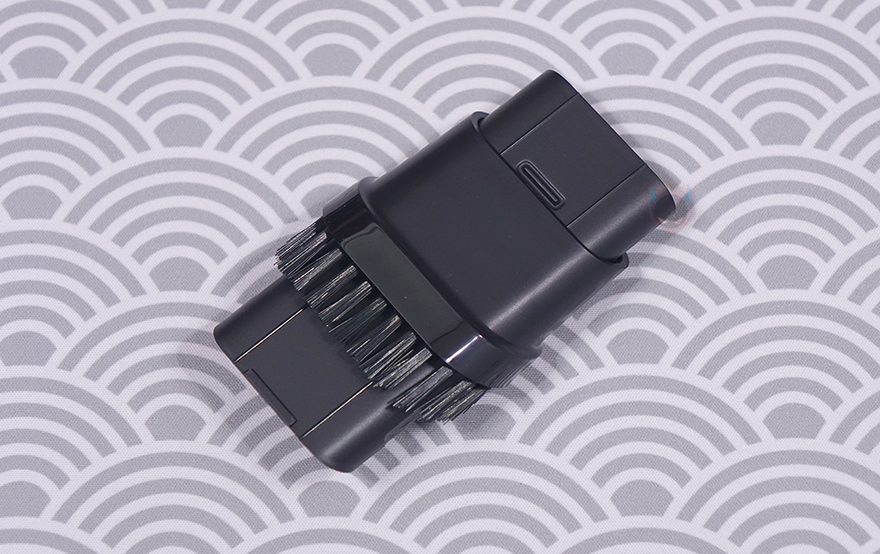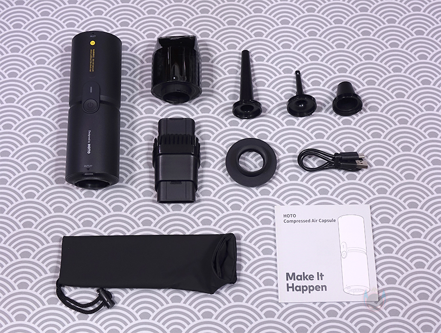 그리고, 마지막으로 공기를 빼주는 진공 수축 커넥터(Vacuum deflating connector)도 제공을 해주는데, 기본적으로는 흡입구쪽에 연결해서 공기가 들어있는 물체의 공기를 빼낼 때 사용하지만, 후면 배출구에도 연결해서 사용해도 상관없습니다. 예를 들어 지퍼백 같은 비닐 주머니에 공기를 뺄 때나 공기를 불어넣을 때 둘 다 가능하다는거죠. 물론, 공기를 빼낼 때는 내부에 먼지나 가루 같은 불순물이 있으면 안됩니다. 먼지통을 연결해서 사용하는게 아니라서 불순물이 흡입되면 내부 모터 고장에 원인이 될 수 있습니다. 쉽게 말해 진공 포장 같은 작업을 할 때만 사용하는거죠. 끝으로, 기본 제공되는 USB 충전케이블은 USB Type-A to C 인터페이스를 가졌으며, 사용하지 않을 때 보관할 수 있는 전용 파우치는 내부에 작은 주머니가 들어있어서 몸체와 커넥터들을 따로 담아서 보관할 수 있습니다.