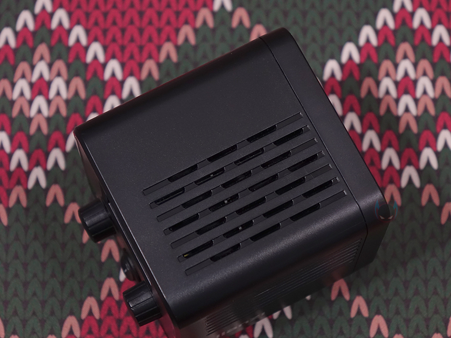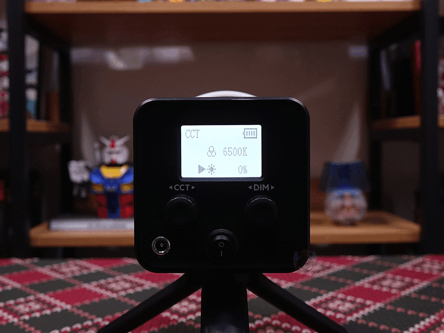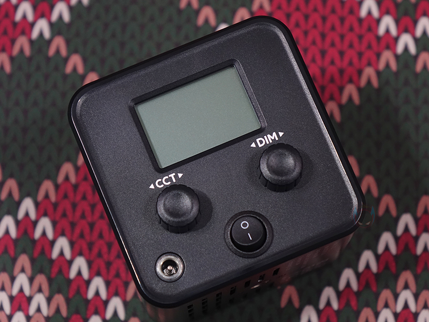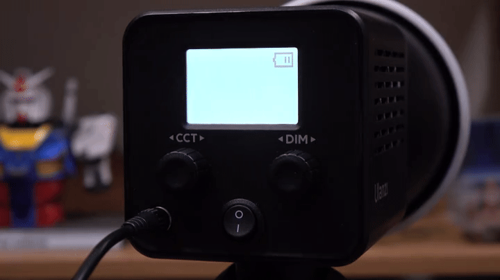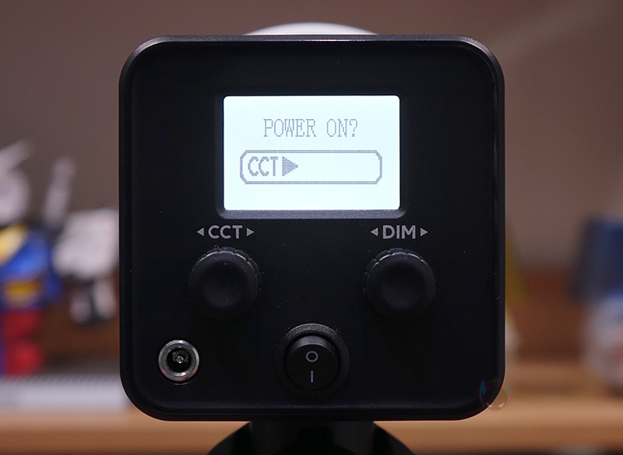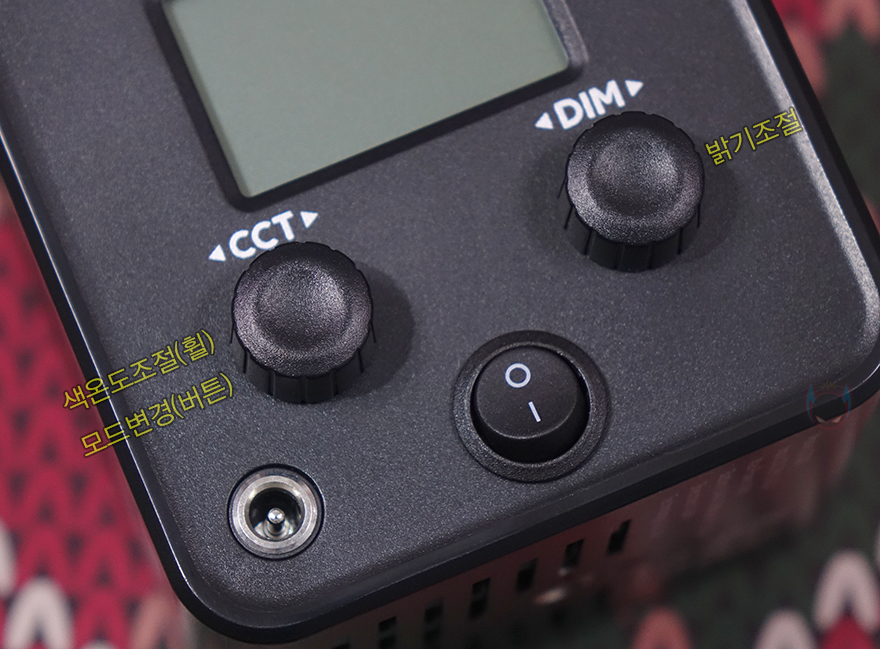 그리고, 본체 후면에는 작동상태를 확인할 수 있는 약 1.77인치 크기의 디스플레이 화면이 적용되어 있으며, 바로 아래에는 2개의 노브(Knob) 컨트롤러 적용되어 있는데, 왼쪽(CCT)은 노브와 버튼 2가지 역할로 노브로 사용할 때는 색온도조절, 버튼으로 사용할 때는 모드변경으로 앞서 제품설명서에서 확인했듯이는 모드는 총 8가지를 갖추고 있습니다. 그리고, 오른쪽(DIM) 노브는 밝기조절 기능을 가졌죠. 또한, 아래 중간에는 전원 스위치가 배치되어 있으며, 왼쪽에는 전원어댑터와 연결되는 전원 포트가 적용되어 있는데, 조금 아쉬운 점이라면 배터리가 내장된 제품이라 DC 포트보다 USB Type-C 방식이었으면 더 좋지 않았을까 생각합니다.