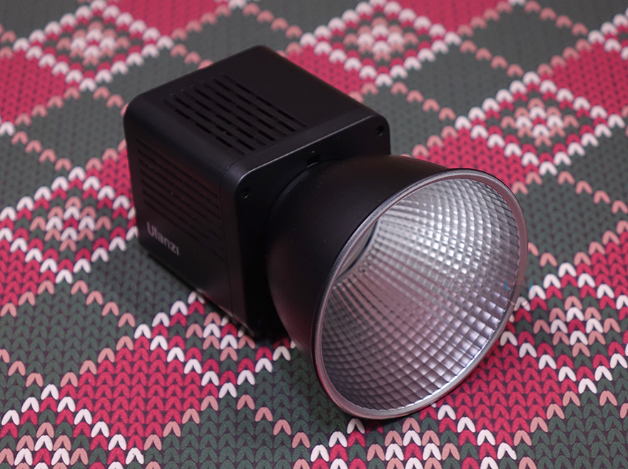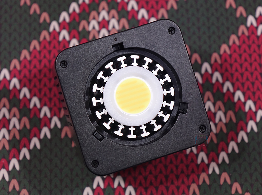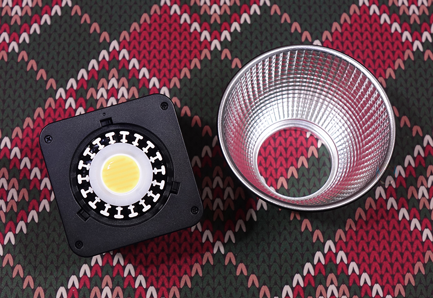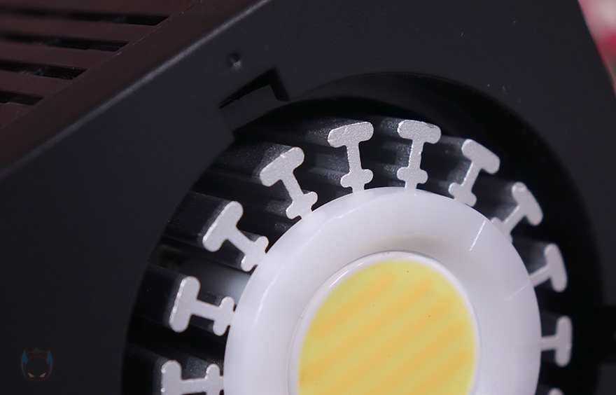 그럼, 본격적으로 Ulanzi(울란지)의 LT028 COB 조명을 살펴보는데, 전체적인 디자인은 일반 촬영조명 제품과 큰 차이가 없습니다. 전면에는 반사경(Reflector)이 적용되어 있는데, 안쪽을 보면 COB LED가 적용된 것을 쉽게 확인할 수 있죠. 물론, 반사경은 분리도 가능한데, 시계 반대방향으로 돌리면 쉽게 분리가 되죠. 반사경 입구의 직경은 약 105mm이며, COB LED 주변에는 발열해결을 위해 360˚ 범위로 방열판(Heatsink)이 적용되어 있습니다. 참고로, 앞서 제품 설명서에서 확인했듯이 COB LED의 색온도 범위는 2500~6500K이고, 100% 설정에서의 조도 밝기는 13260 Lux(디퓨저사용)입니다.