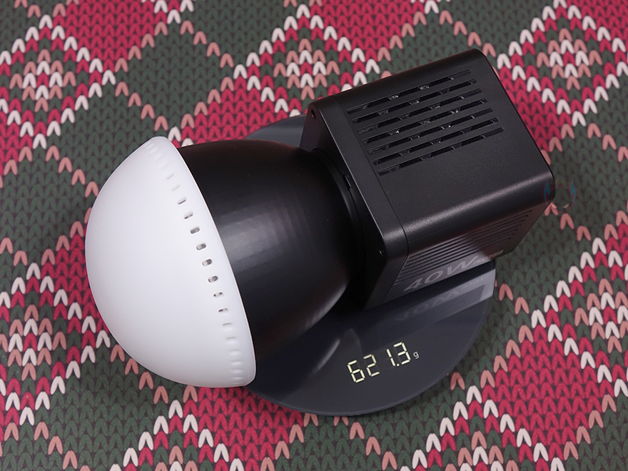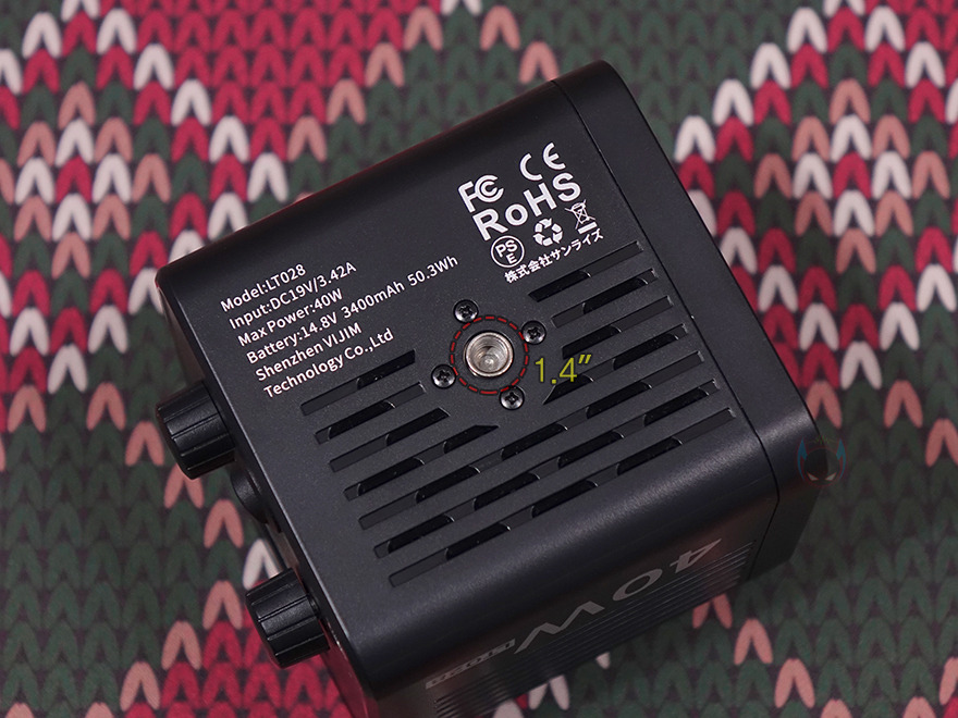 반사경을 분리한 상태에서 조명 본체를 살펴보면, 본체 한쪽 측면에는 모델명과 함께 앞서 제품박스에서 확인했던 최대 전력소모 40W 표기를 다시 확인할 수 있는데, COB 조명 제품 중에는 60W, 100W 그 이상도 있기 때문에 높은 편에 속하는 건 아닙니다. 물론, COB 조명 특성상 발열이 생기기 때문에 앞서 전면에 확인한 COB LED 주변 방열판 외에도 본체 측면마다 발열이 배출될 수 있도록 에어홀 처리도 적용되어 있죠. 그리고, 밑바닥에도 에어홀 처리가 되어있으며, 간략한 기본 사양표기와 함께 삼각대 같은 거치대에 장착할 수 있도록 1/4인치 나사홀이 중앙에 적용된 것을 확인할 수 있습니다. 참고로, 기본 사양에 표기된 것처럼 내부에는 3400mAh 용량의 배터리가 내장되어 있는데, 이는 현재 충전식 COB 조명 제품 중에서는 대용량에 속하는 용량입니다.