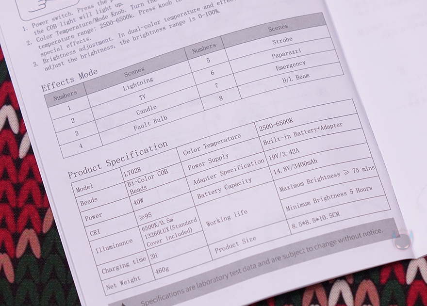 제품 구성은 LT028 COB 조명, 디퓨저(Diffuser), 전원어댑터 및 전원케이블, 제품설명서로 이루어져 있으며, 제품 박스에서 확인할 수 없었던 제품의 기본 사양 표기는 설명서에서 확인할 수 있습니다. 모델명부터 시작해 사용시간 배터리 용량, 제품 크기 등 상세하게 표기하고 있으며, 뒤에서 확인하겠지만, 조명 효과모드도 바로 위에 8가지로 표기를 해놨죠.