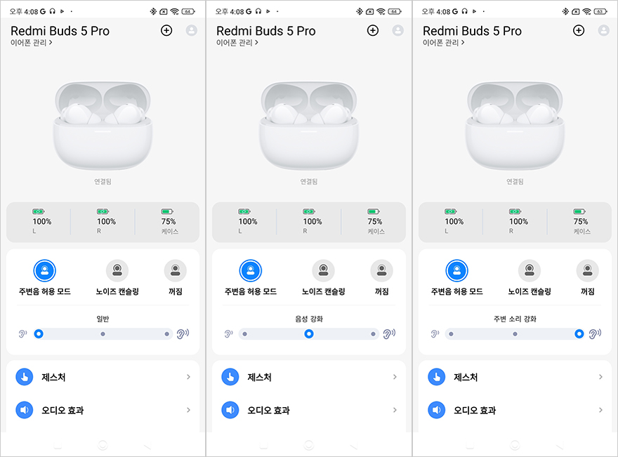 Xiaomi Earbuds 어플로 연결된 레드미 버즈 5 프로 무선이어폰의 기능 지원을 살펴보면, 일단 메인 화면은 앞시간에 먼저 만났던 기본 모델과 마찬가지로 배터리 잔량을 충전케이스, 좌우 이어폰 구분해서 보여줍니다. 그리고, 프로 모델 역시 주변 소음 강도조절을 할 수 있는 모드를 3단계로 조절할 수 있고, 노이즈 캔슬링(Noise canceling) 모드 역시 3단계로 조절이 가능하고, 추가로 프로 모델에선 적응형과 맞춤형 노이즈 캔슬링을 선택할 수도 있습니다. 또한, 제스처 설정을 통해서는 좌우 이어폰의 터치-탭 설정을 할 수 있는데, 1 터치부터 3 터치 그리고 탭 누르기까지 설정할 수 있으며, 탭 누르기는 노이즈 캔슬링과 음성 검색 실행 둘 중 하나를 선택할 수 있습니다. 그리고, 오디오 효과를 통해서는 공간효과 그러니깐 앞서 제품박스에서 언급한 몰입형 오디오 모드의 디멘션널 오디오를 지원하는데 표준/음악/영상 중 선택할 수 있으며, 자동으로 소리조절해 주는 어댑티브 사운드 지원도 해주고 있습니다. 그리고, 오디오 밸런스를 선택하면 기본 모델 레드미 버즈 5처럼 표준/고음/저음/음성 강화 선택을 할 수 있는 건 물론이고, 추가로 사용자 지절의 이퀄라이저 지원도 해주고 있습니다. 이 외에도 공용적으로 지원해 주는 착용감 테스트, 이어폰 찾기 기능이 있으며, 장치정보로 들어가면 제품 사용법도 확인할 수 있죠. 공융 기능을 제외하면 프로 모델답게 기본 모델보다 좀 더 다양한 기능을 지원해주고 있습니다.