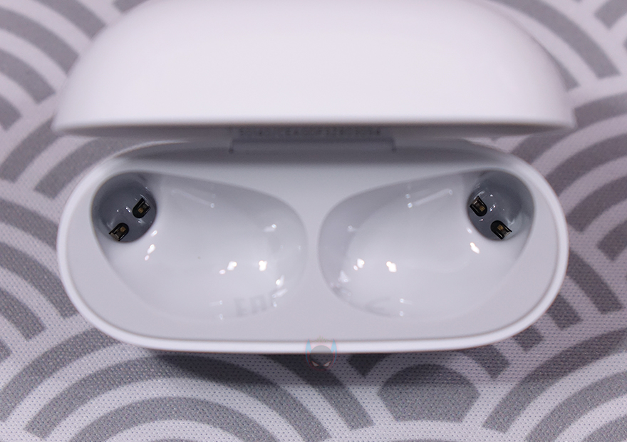 충전케이스를 열어보면, 측면에서 봤을 때 케이스가 수평 형태로 열리는게 아니라 경사진 각도형태로 열리는데 아무래도 타원형 디자인을 가졌기 때문에 좀 더 자연스러움을 주기 위함이라 할 수 있습니다. 그리고, 충전케이스에 수납된 이어폰(Earphone)을 꺼내면 케이스 양쪽 끝부분에 이어폰의 스템(Stem) 부분과 접촉하는 충전-핀을 확인할 수 있죠. 참고로, 충전케이스의 배터리 용량은 480mAh로 앞서 만난 기본 모델 레드미 버즈 5와 동일합니다.