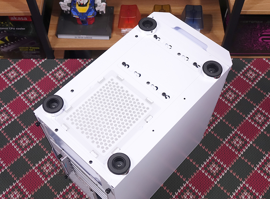 FARA H1M PC케이스 외형 끝으로, 케이스 밑바닥부분을 살펴보면, 원형 디자인의 약 14mm 높이 받침대가 적용된 것을 확인할 수 있으며, 내부에서 다시 확인하겠지만, 앞부분에는 내부 HDD 베이를 분리할 수 있게 나사로 고정되어 있습니다. 그리고, 뒷부분 파워서플라이 자리에는 분리형 먼지 필터와 함께 필터를 분리하면 쿨링효과를 위해 에어홀도 처리된 것을 확인할 수 있죠.