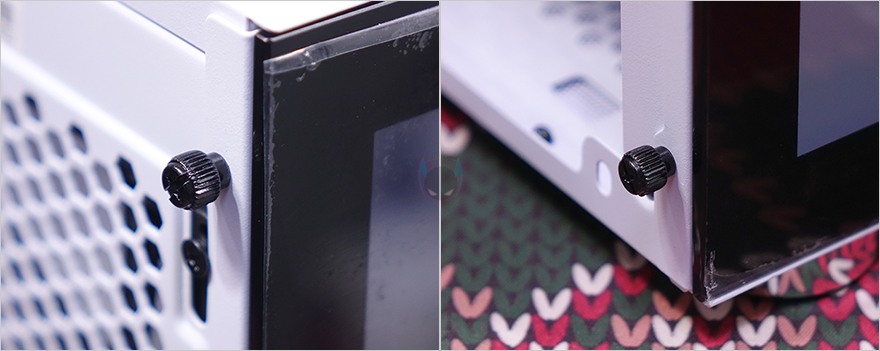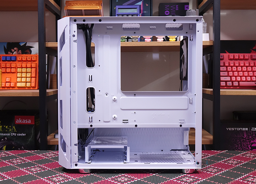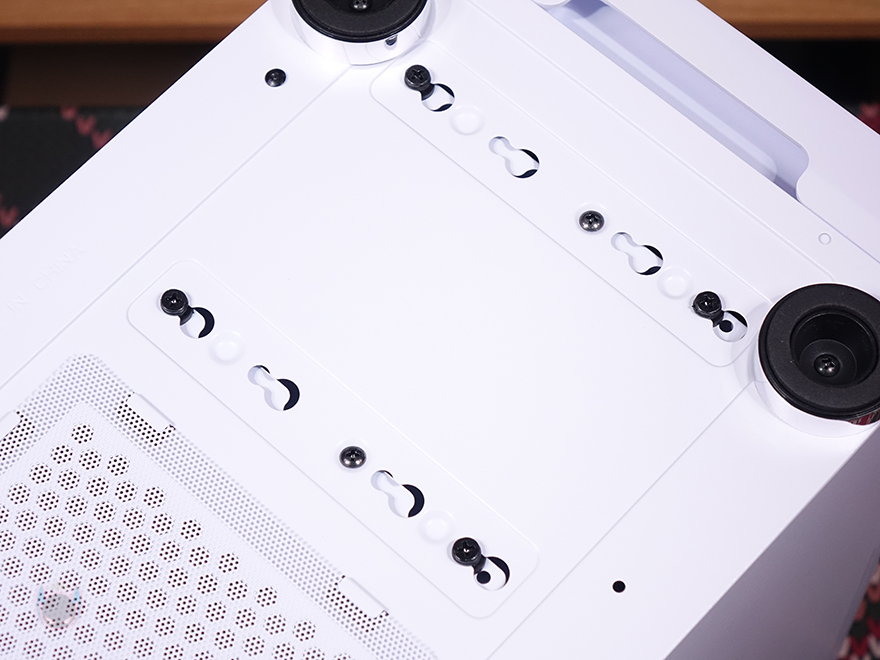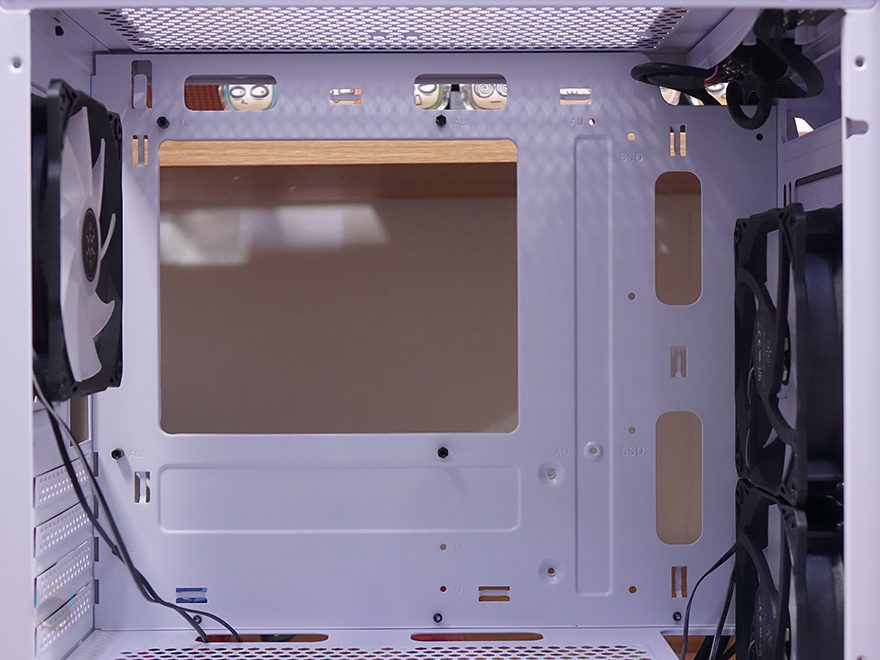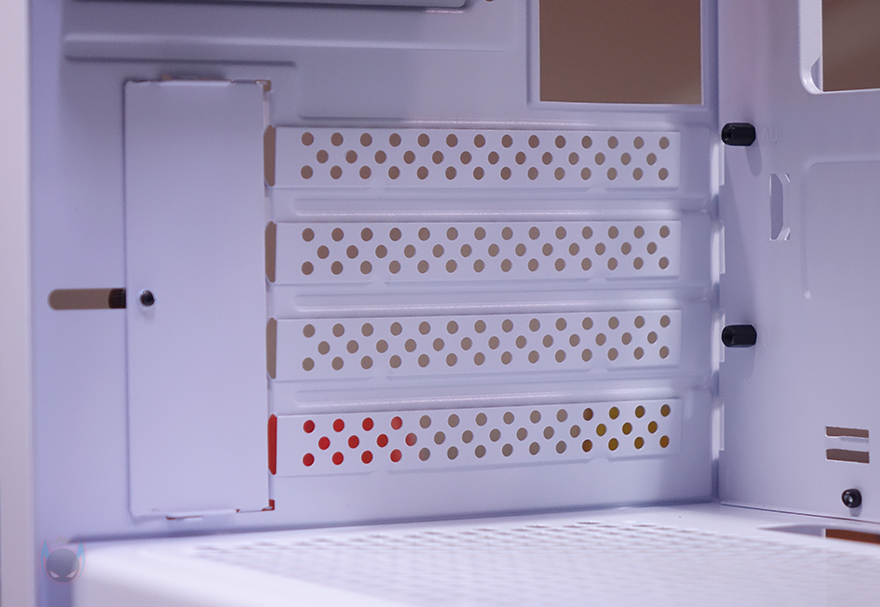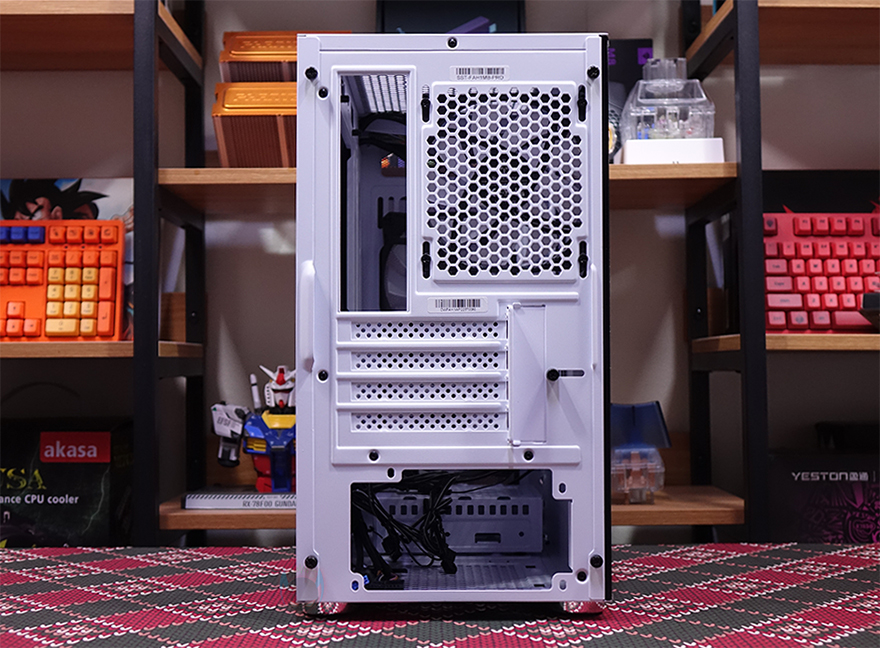 사이드 패널은 앞서 언급했듯이 FARA H1M 모델 중 화이트 색상은 왼쪽 패널을 강화유리(Tempered glass)로 적용했으며, 후면 위아래에 각각 손나사로 고정되어 나사를 풀면 일반 패널처럼 후면으로 당겨서 분리하는 방식입니다. 반대편인 오른쪽 패널은 일반 샤시 패널의 민무늬로 처리되어 있죠. 그리고, 케이스 후면에는 배기역할로 에어홀 처리와 함께 내부에 120mm 팬이 기본 장착된 것을 간접적으로 먼저 확인할 수 있으며, 아래에 PCI 슬롯은 미니타워 기준인 4개의 슬롯 자리를 갖추고 있습니다. 맨 아래에는 파워서플라이 자리로 상하방향으로 모두 장착할 수 있게 나사홀이 처리되어 있죠.