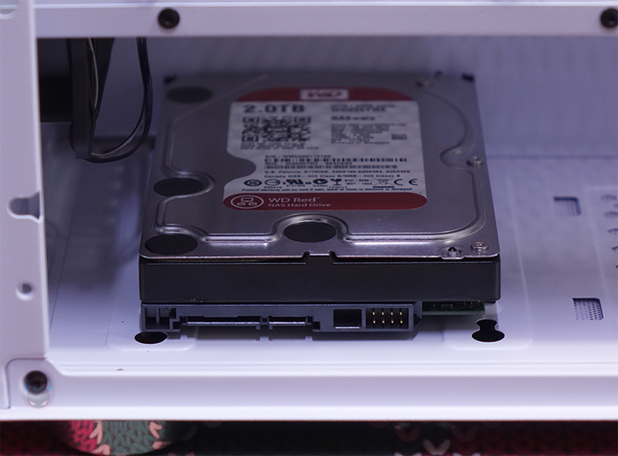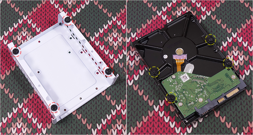 메인보드 트레이 후면쪽에는 하단에 파워서플라이와 저장장치가 장착되는 공간을 확인할 수 있는데, 파워서플라이 공간에는 샤시 자체로 받침대 모양을 적용했으며, 별도의 패드는 부착되어 있지 않습니다. 그리고, 하단 공간 앞자리에는 HDD를 장착할 수 있는 HDD 베이(Bay)가 장착되어 있는데, 앞서 외부에서 언급했듯이 외부 하단에서 고정된 나사 2개를 풀면 쉽게 분리가 됩니다. HDD 베이에는 안쪽에 기본 3.5인치 HDD 1개를 장착할 수 있고, 베이 상단에는 3.5인치 HDD나 2.5인치 HDD/SSD를 추가로 장착할 수 있습니다. 그리고, 만약 케이블 정리 공간이 부족하다면, HDD 베이를 장착하지 않거나 HDD 베이에 장착된 고정 나사를 풀어서 3.5인치 HDD에 장착하면 베이를 사용하지 않고도 내부 하단에 HDD를 장착할 수 있죠.