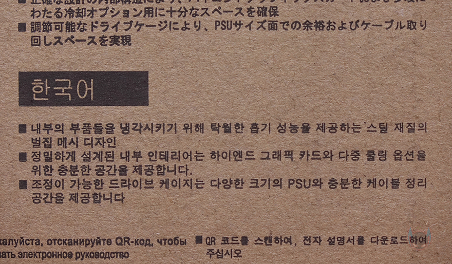 제품 박스는 M-ATX 메인보드 기반의 미니타워 PC케이스이기때문에 작은 편입니다. 그리고, 박스 전후면에는 동일하게 디자인으로 해당 모델의 전면 그림 이미지와 함께 모델명을 표기해 놨는데, 모델명 아래 콘셉트 문구에도 M-ATX 기반과 쿨링을 강조한 표기를 해놨죠. 박스 한쪽 측면에는 한국어를 포함해 다국적 언어로 제품의 주요 특징을 표기해 놨으며, 반대쪽 측면에는 제품의 기본 사양 표기를 해놨는데, 메인보드 규격부터 저장장치 지원, PCI 슬롯, 파워(PSU) 규격, 케이스 크기까지 확인할 수 있습니다.