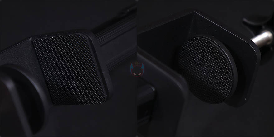 암(Arm)과 연결되는 동시에 책상에 고정할 수 있는 클램프(Clamp)는 고정부분은 제외하고 약 295mm의 길이를 가지고 있으며 C-Type으로 면적도 넓고, 최대 50mm 두께까지 고정할 수 있습니다. 또한, 접촉되는 안쪽부분에는 접지력이 높도록 패드 부착도 기본 적용되어 있죠. 암(Arm)과 C-클램프(Clamp) 연결은 서로 홈에 맞춰 끼운 후 고정해주면 되는데, 고정하기 전 360˚ 회전이 가능하기 때문에 암 위치선정을 자유롭게 할 수 있습니다. 참고로, 관절 고정의 노브(Knob)와 길이부분들은 모두 알루미늄 합금(Aluminum Alloy)이라 내구성도 충분히 보장해주죠.
