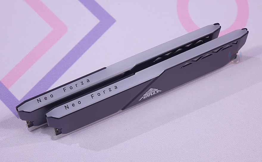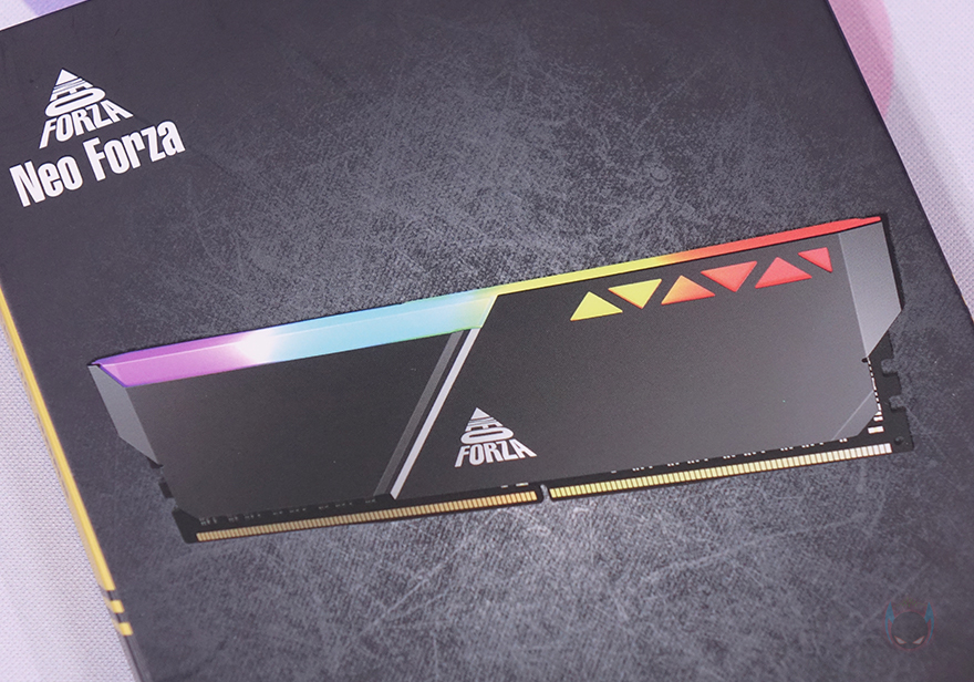 방열판 중간에는 로고(logo)를 새겨놨으며, RGB 효과를 볼 수 있는 상단 LED 바(bar)는 측면에서 봤을 때 반으로 나뉘어 한쪽은 그대로 노출된 디자인이고, 나머지 반은 방열판 일부가 덮힌 디자인입니다. 또한, 방열판 반대쪽 한쪽에는 역시 Neo Forza를 새겨놨으며, LED 바 상단에도 동일하게 표기를 하고 있죠.