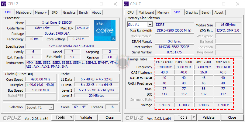시작에서 언급했듯이 TRINITY RGB DDR5 7200MHz 메모리는 하이닉스 A다이(Hynix A-Die) 칩을 사용했습니다. 그래서, 현재 TRINITY RGB DDR5 메모리 최대 클럭 모델은 7800MHz까지 나왔으며, 8000MHz 클럭도 준비중이죠. 물론, 소비자가 메모리 모듈칩을 확인할 수 있는 방법은 Thaiphoon Burner 프로그램밖에 없는데, TRINITY RGB DDR5 7200MHz 메모리를 확인해보면, 하이닉스 A다이 확인이 안됩니다. 물론, CPU-Z를 통해 램 제조사가 SK 하이닉스(Hynix)인걸 확인할 수 있죠. 그래서, 하이닉스 A다이가 사용되었다면, TRINITY RGB DDR5 7200MHz 메모리는 이보다 더 높은 정확히는 1.4V기준으로 CPU나 메인보드가 고급형이라면 7600MHz까지 어렵지 않게 오버클럭할 수 있습니다. 그래서, 직접 수동 오버클럭을 해 본 결과, 7600MHz 클럭까지 쉽게 적용된 것을 확인했고, 램 타이밍도 상위 모델처럼 CL36으로 적용했습니다.