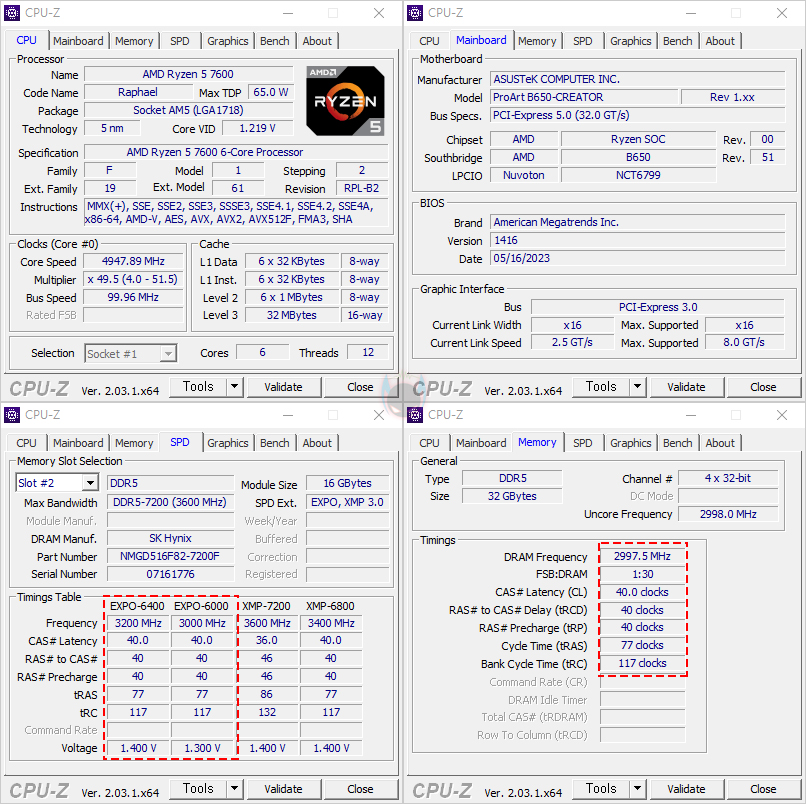 끝으로, 앞서 TRINITY RGB DDR5 7200MHz 메모리에 저장된 프로파일을 확인했듯이 인텔 XMP와 AMD EXPO 둘 다 적용되어 있는데, 인텔과 AMD 메모리 컨트롤러와 메모리 클럭 비율이 다르죠. 그래서, AMD 기반 PC에서 하이닉스 A다이 메모리를 사용하면 오버클럭을 했을 때 최고 높은 클럭이 6400MHz이며 평균적으로 6000~6200MHz 클럭으로 오버클럭되는경우가 많습니다. 그래서, TRINITY RGB DDR5 7200MHz 메모리에 EXPO 프로파일 값이 6000MHz과 6400MHz 2가지인데, 리뷰에선 AMD PC에서 사용했을 때, 6000MHz까지 적용된 것을 확인할 수 있었죠. 물론, AMD 역시 CPU와 메인보드 환경에 따라서 6400MHz까지 적용될 수 있습니다.