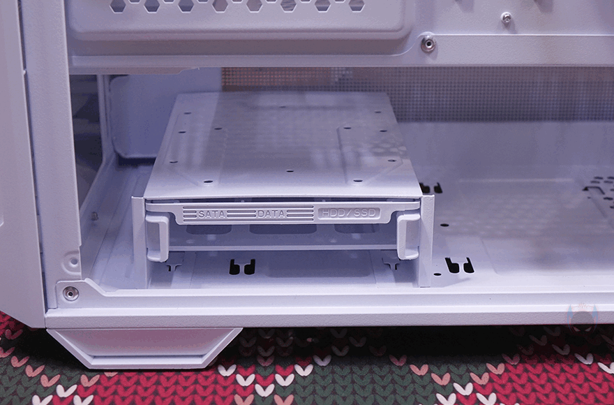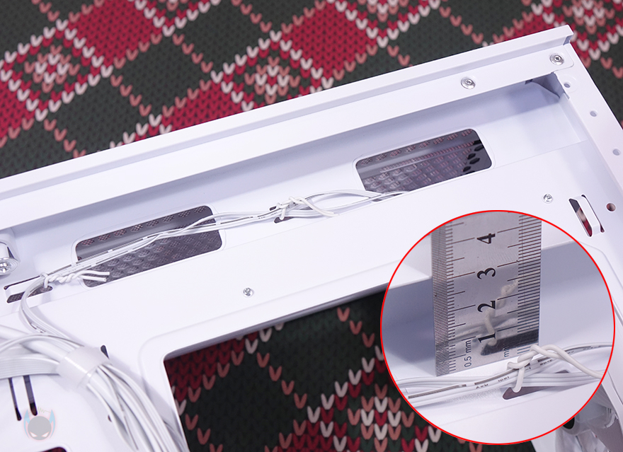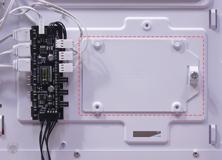 내부 후면 그러니깐 메인보드 트레이 후면을 살펴보면, CPU-cut-Out 바로 아래에는 팬 컨트롤러 허브가 장착되어 있는데, 팬만 연결되는게 아니고 ARGB도 함께 컨트롤할 수 있게 지원하고 있습니다. 허브 기판 왼쪽에는 ARGB 커넥터가 6개, 오른쪽에는 팬 커넥터가 6개로 총 6개의 팬을 연결해서 하나로 컨트롤할 수 있습니다. 그리고, 허브 바로 오른쪽에는 추가로 2.5인치 HDD/SSD를 1개 장착할 수 있는데 브라켓이 장착되어 있으며, 손나사를 풀면 쉽게 분리가 되고, 허브를 사용하지 않는다면, 분리시킨 후 브라켓을 수평 방향으로 장착해서 사용할 수도 있습니다. 그리고, 트레이 윗부분 선정리-홀의 공간 같은 경우에는 홈-처럼 안쪽으로 한 번 들어간 형태로 좀 더 넓은 공간의 케이블 정리공간을 확보하고 있는데 약 30mm 깊이를 가졌죠.