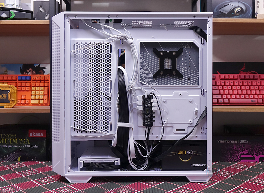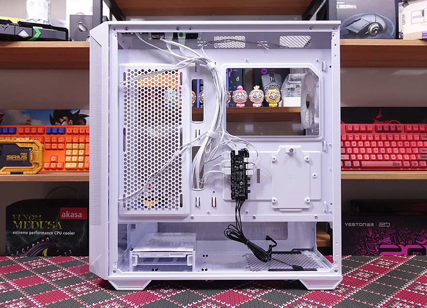 메인보드 후면 공간은 약 24mm 공간을 가지고 있어서 케이블정리를 하는데 큰 어려움은 없으며, 조립 시 한 가지 알아둬야 할 점이라면 측면 커버를 사용할 때 2.5인치 HDD/SSD를 미리 장착해야 하고, 이를 연결하는 SATA 케이블과 파워서플라이 케이블도 미리 저장장치에 연결하고 커버를 장착해야 합니다. 조립 마무리로 전면 160mm 팬 2개와 후면 120mm 팬 1개를 허브에 연결하고 메인보드 ARGB 헤더에 연결한 후, 전원을 켜면 연동되는 RGB 효과를 볼 수 있습니다. 물론, 케이스 상단에 LED 모드 버튼이 있기 때문에 모드 버튼을 통해서도 팬의 다양한 RGB 모드 효과를 볼 수 있죠.