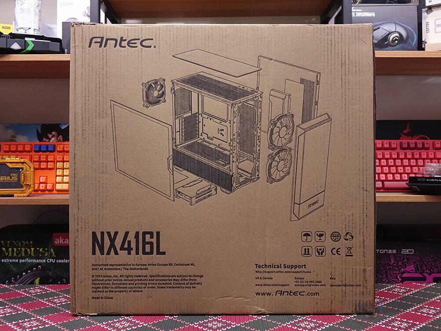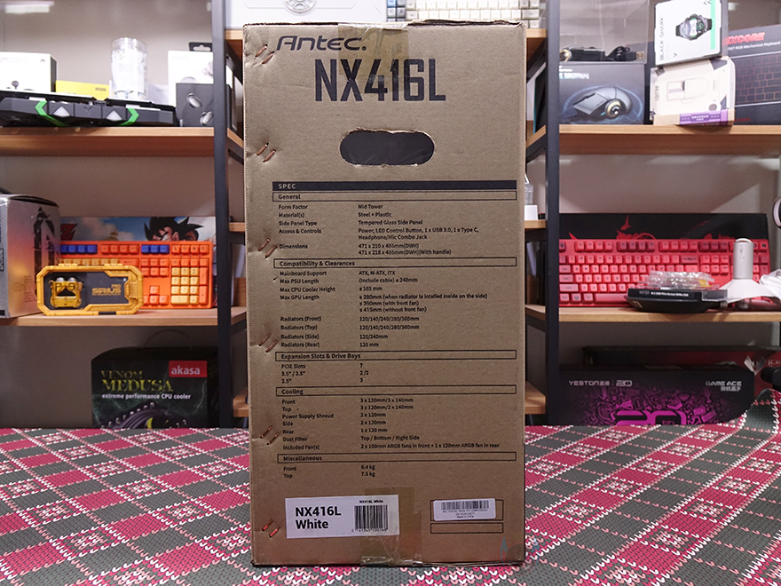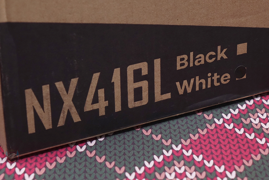 제품 박스부터 살펴보면, NX416L 모델은 미들타워 PC케이스이기때문에 박스 부피가 좀 있습니다. 그리고, 전면에는 모델명과 함께 색상 구분 표시도 해놨는데, 시작에서 언급했듯이 NX416L은 블랙과 화이트 2가지 색상으로 출시되었습니다. 그리고, 45도 방향으로 제품 이미지를 담고 있는데, 바로 옆 박스 측면에는 전면 방향의 이미지도 함께 담고 있죠. 박스 후면에는 제품 분해도처럼 이미지도 담고 있어서 PC케이스에 관심 많은 소비자라면 대략적인 구조도 파악할 수 있으며, 또 다른 측면에는 제품의 크기부터 쿨러 높이, 그래픽카드 길이, 라디에이터, 팬 지원 등 상세하게 사양을 표기하고 있어서 충분히 구입 시 제품 정보를 얻을 수 있겠습니다.