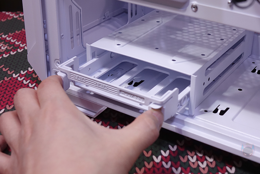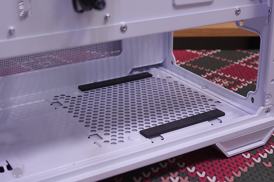 그리고, 후면에서 내부 하단 공간을 확인해보면, 파워서플라이가 장착되는 자리에는 기본적으로 샤시 자체의 받침대 부분 외에도 진동소음을 줄이도록 패드를 부착해 놨으며, 앞부분 공간에는 HDD베이가 장착되어 있는데, 앞서 언급했듯이 분리가 가능해 위치이동이 가능합니다. 그리고, HDD베이는 1개의 HDD 가이드가 장착되어 있으며, 기본적으로 무나사 방식으로 HDD를 장착할 수 있는 가이드이며, 추가로 나사를 사용할 수도 있습니다. 물론, 2.5인치 HDD/SSD 장착도 가능하죠. 그리고, HDD베이 상단에도 3.5인치 HDD나 2.5인치 HDD/SSD를 장착할 수 있습니다. 끝으로, NX416L PC케이스의 화이트 색상모델 같은 경우에는 허브 장치를 제외하고 앞서 확인한 케이스 버튼과 포트 등의 패널 케이블과 기본 장착된 팬들의 케이블도 모두 화이트 색상으로 통일시켜 놨습니다.
