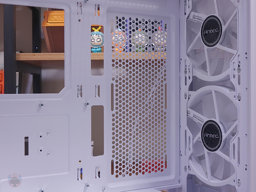외형부터 살펴보면, 전면 베젤은 절반이상의 면적이 메쉬 디자인을 적용하고 있습니다. 그리고, 간접적으로 내부에 팬이 2개 기본 장착된 것도 확인할 수 있고, 메쉬 부분이 아닌 아랫부분에는 심플하게 Antec 로고만 새겨놨습니다. 전면 베젤에 버튼이나 포트가 적용되어 있지 않아서 바로 분리도 가능한데, 베젤을 분리하면 방금 언급한 2개의 기본 장착 팬을 확인할 수 있습니다. 이 2개의 팬은 이번 NX416L 모델의 가장 큰 특징이라 할 수 있는데, 바로 160mm 크기의 팬을 사용했기 때문입니다. 10만 원 이하의 PC케이스 제품들을 보면 대부분 120mm나 140mm 팬을 기본 제공하는 경우가 많은데, NX416L은 이보다 큰 160mm 팬을 2개 장착하고 나온 거죠. 특히, 팬 크기는 160mm면서 팬 장착 규격은 120mm와 140mm 2가지 나사홀로 처리되어 있어서 장착 호환성도 높습니다. 물론, 팬은 RGB로 정확히는 ARGB 팬이죠. 참고로 표준 규격의 120mm와 140mm 팬을 사용한다면 3개까지 장착이 가능하고, 수랭쿨러시 라디에이터도 360mm까지 장착이 가능합니다.
