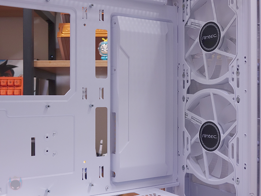 이제, 안텍(Antec) NX416L PC케이스의 내부를 살펴보는데, 화이트 색상경우 내부도 화이트 색상으로 도색처리되어 있으며, 메인보드가 장착되는 트레이(Tray) 부분에는 CPU-cut-Out을 비롯해 주변으로 케이블 정리를 할 수 있게 선정리-홀이 처리되어 있습니다. 그리고, 앞부분 측면 그러니깐 외부에서 봤을 때 오른쪽 패널의 측면 에어홀 위치에 내부에는 커버가 적용되어 있는데, 후면에서 나사를 풀면 쉽게 분리가 되고, 커버는 안쪽에는 2.5인치 HDD/SSD 2개를 장착할 수 있는 공간이 있습니다. 쉽게 말해, 저장장치 겸 후면 케이블이 보이지 않게 커버 역할을 동시에 하는 거죠. 물론, 커버를 사용하지 않으면 측면에 추가로 쿨링시스템을 갖출 수 있게 에어홀 처리와 함께 나사홀이 처리되어 있죠. 참고로 팬을 장착하면 120mm 팬을 2개 장착할 수 있고, 수랭쿨러 라디에이터를 장착하면 240mm까지 가능합니다.