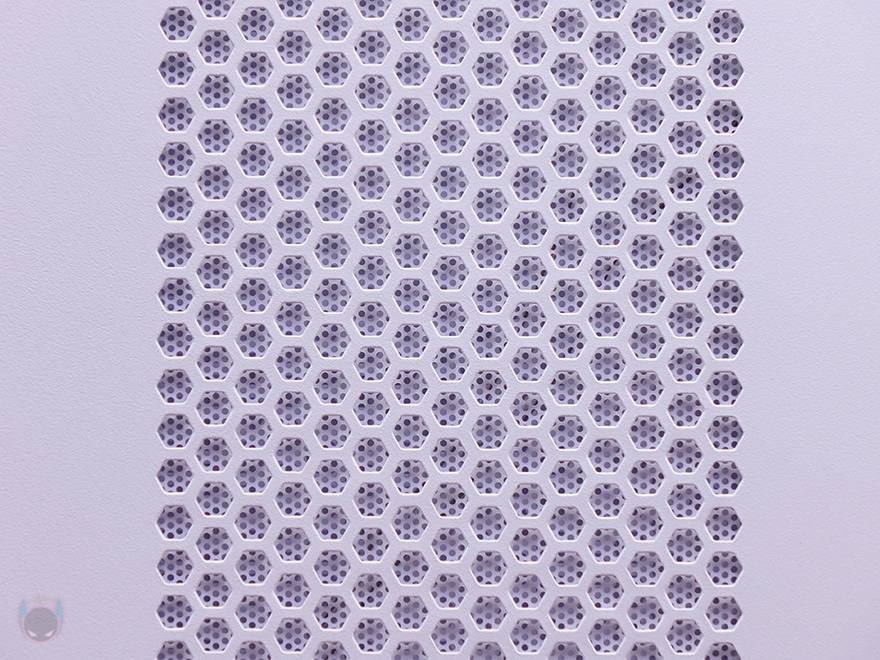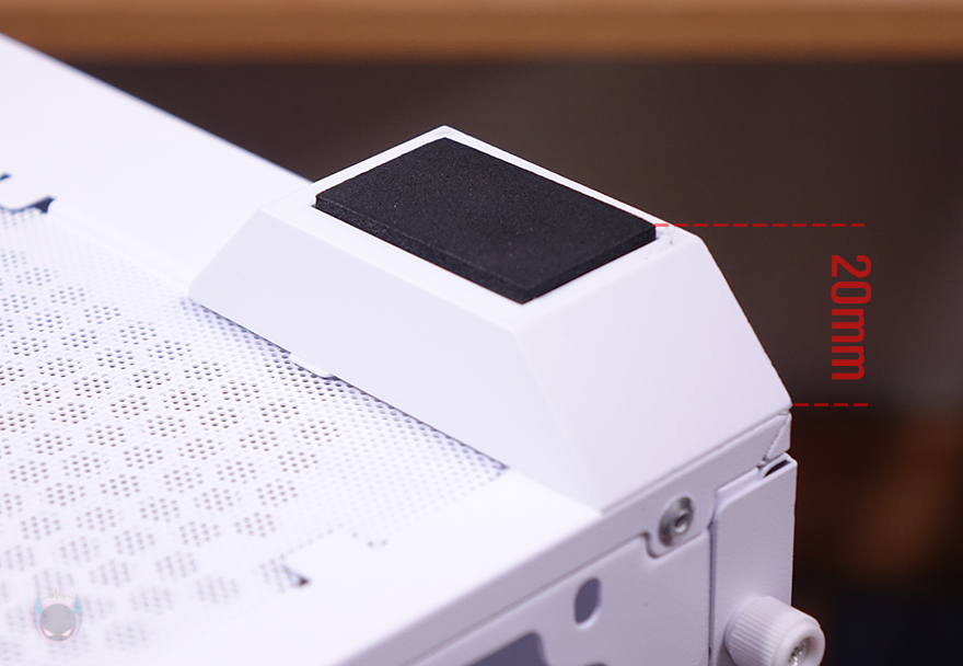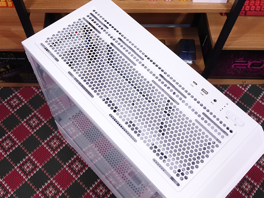 NX416L PC케이스 상단에는 맨 오른쪽 부분에 후방향 일렬로 버튼 및 포트가 배치되어 있는데, 전원 버튼, 리셋 버튼, 작동 상태 LED 램프, MIC/EAR 포트, USB 3.0 포트, USB 타입C 포트순입니다. 그리고, 나머지 영역은 상단 쿨링시스템 지원을 위해 모두 에어홀 처리를 해놨는데, 자석방식의 먼지 필터를 분리하면 쉽게 확인이 되죠. 또한, 에어홀 자리에는 추가로 팬과 수랭쿨러 라디에이터를 장착할 수 있게 지원해주고 있는데, 팬은 120mm 최대 3개, 140mm 최대 2개, 라디에이터는 360mm까지 가능합니다. 특히, 전후방향으로 위치조절을 자유롭게 할 수 있도록 나사홀도 길게 처리되어 있죠.