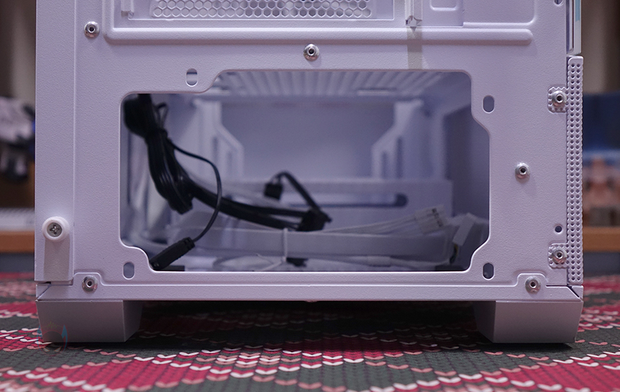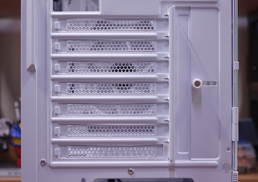 그리고, 내부 하단 공간 역시 커버를 적용했으며, 역시 쿨링효과를 위해 에어홀 처리는 기본이고, 주변으로 케이블 이동시 수월하도록 홀-처리도 해놨으며, 추가로 120mm 팬을 2개 장착할 수 있게 나사홀도 처리되어 있습니다. 내부 후면에는 앞서 외부 후면에서 확인했던 120mm 팬을 확인할 수 있는데, 역시 ARGB 팬이며, 전면 팬과는 달리 좀 더 신속한 공기 흐름을 위해 날개 부분에 나선형 라인 디자인이 적용되어 있습니다. 참고로, 전면과 후면 팬 모두 작동 연결방식은 3핀입니다. 그리고, 아래에 PCI 슬롯 가이드는 모두 재사용이 가능한 탈착식으로 사용되었죠.