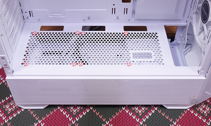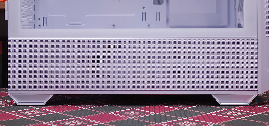 케이스 후면에는 배기 역할의 에어홀 처리와 함께 간접적으로 내부에 120mm 팬이 기본 장착된 것을 미리 확인할 수 있으며, 상단과 마찬가지로 팬 위치 조절을 위아래 자유롭게 할 수 있도록 나사홀을 길게 처리했습니다. 그리고, 아래 PCI 슬롯은 미들타워 기준인 7개를 적용했으며, 맨 아래 파워서플라이 자리는 상하방향으로 모두 장착 가능하게 나사홀이 처리되어 있죠. 외형 끝으로, 케이스 밑바닥에는 약 20mm 높이의 받침대가 적용되어 있으며, 진동소음을 줄이도록 패드도 기본 부착되어 있습니다. 그리고, 앞자리에는 내부에서 다시 확인하겠지만, 내부 HDD베이를 위치이동할 수 있게 지원하고 있으며, 파워서플라이 자리에는 먼지 필터와 함께 역시 쿨링효과를 위한 에어홀 처리가 되어 있죠.
