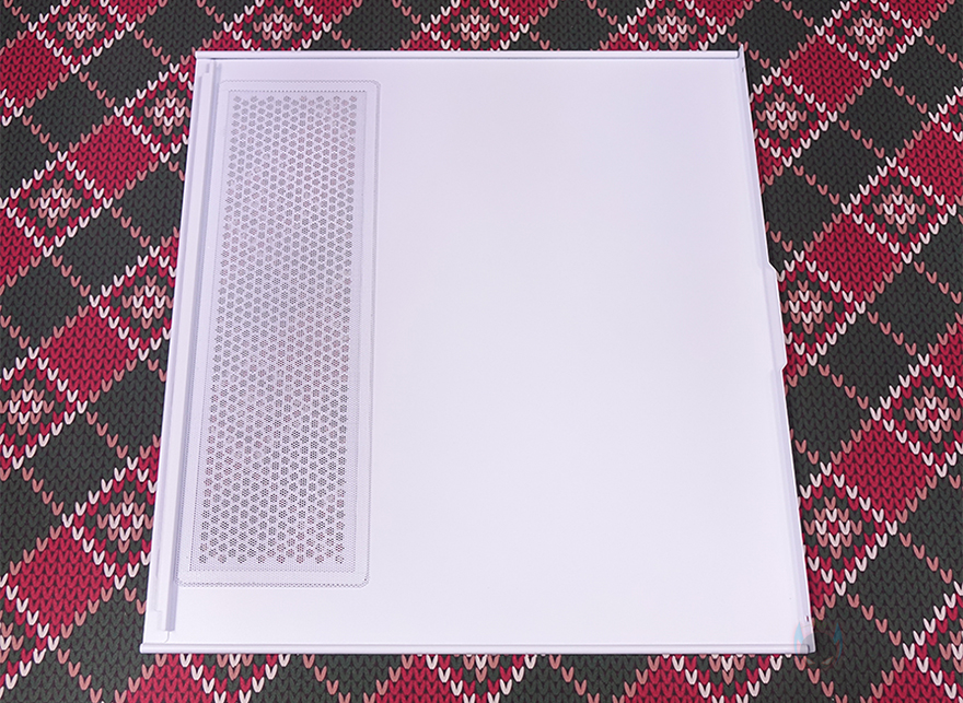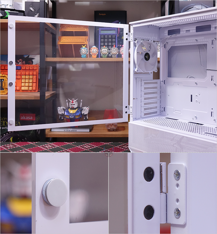 NX416L PC케이스의 사이드 패널은 전면시 왼쪽 패널은 강화유리가 적용되어 있는데, 도어 방식으로 앞부분에 손잡이 디자인이 적용되어 있으며, 안쪽에는 자석방식으로 고정되도록 위아래 각각 자석이 적용되어 있죠. 또한, 힌지 방식으로 패널 분리가 가능하고, 강화유리 영역이 아닌 나머지 아랫부분은 내부 하단 공간의 쿨링효과를 위해 전면처럼 메쉬 디자인을 적용하고 있죠. 참고로 강화유리 두께는 4mm입니다. 그리고, 반대편인 오른쪽 패널은 일반 민무늬 형태에 앞부분에 내부 측면 쿨링효과를 위해 역시 에어홀 처리가 되어 있는데, 패널은 분리해서 안쪽을 보면 자석방식의 먼지 필터도 기본 장착된 것을 확인할 수 있습니다.