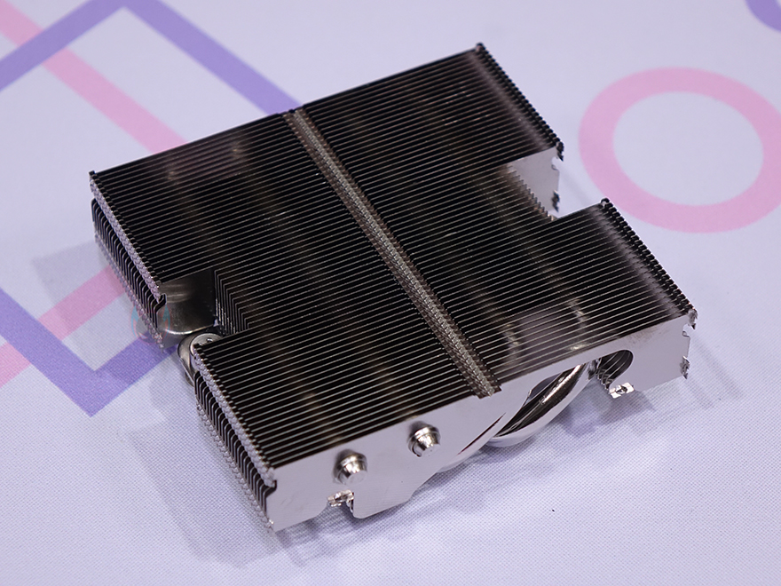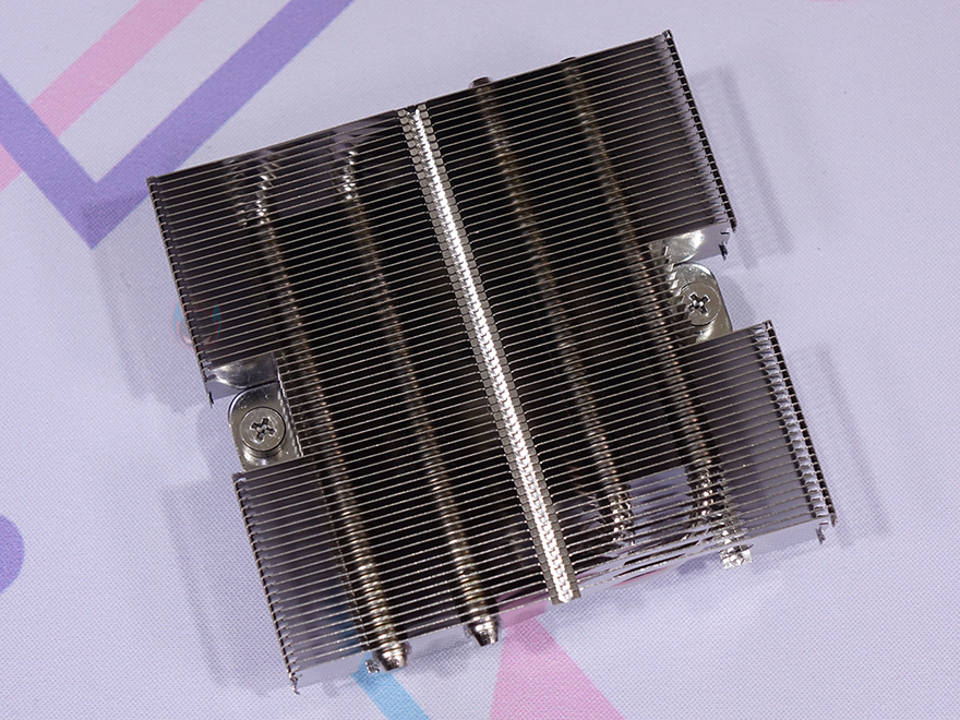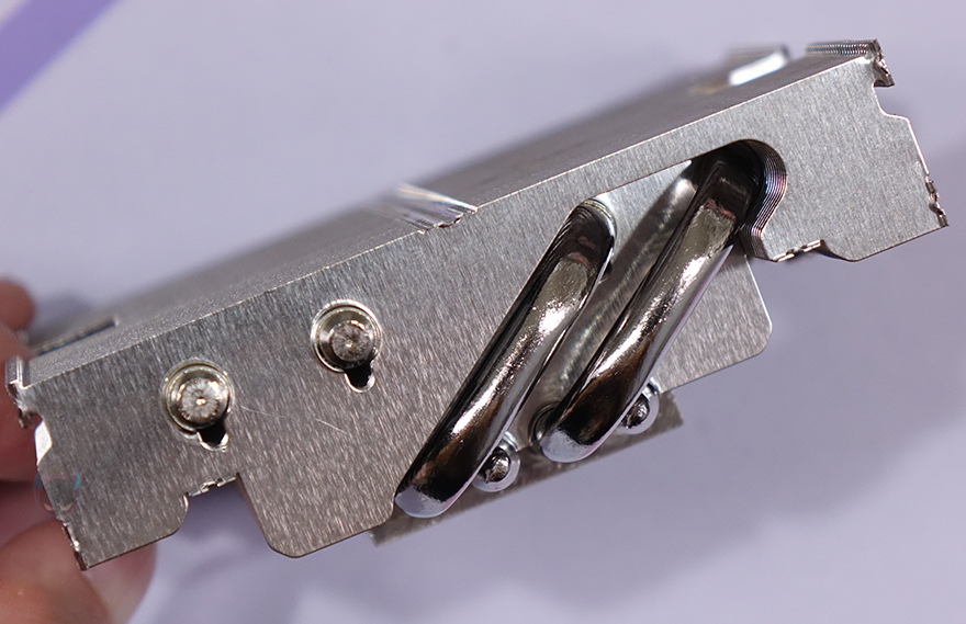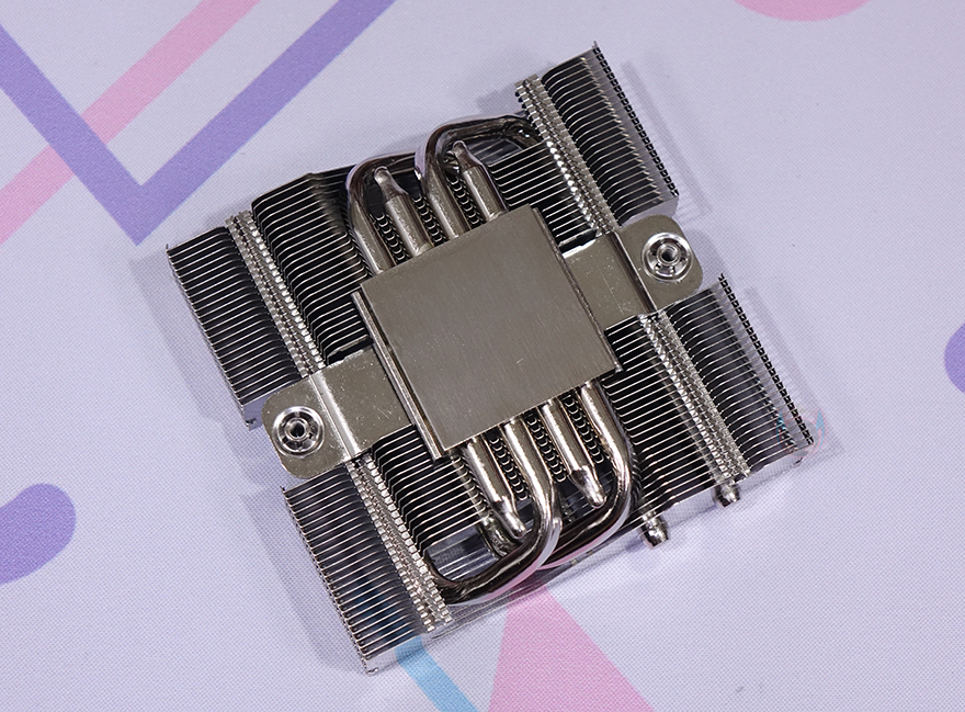 팬을 분리한 상태에서 Hydrogon H90 ARGB 쿨러의 히트싱크만 살펴보면, 방열핀은 총 61개 사용되었으며, 방열핀을 통과하는 히트파이프트는 지름 6mm에 총 4개가 사용되었고, 통과는 솔더링방식이며, 사선방향 U자 구조로 적용되었습니다. 일단, 로우-프로파일에서 히트파이프 4개면 준수한 개수죠. 그리고, CPU와 맞닿는 베이스 부분도 매끄럽게 잘 래핑처리되어 있습니다.