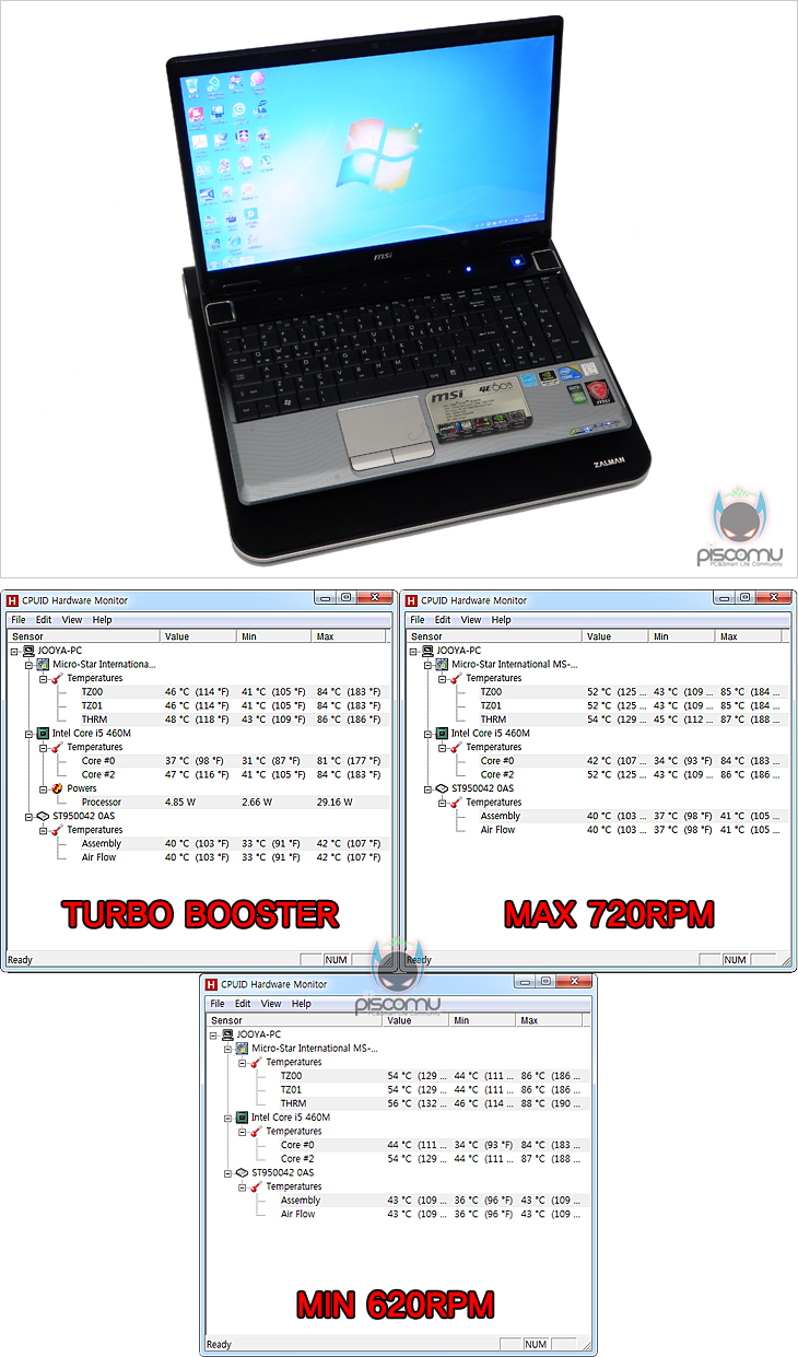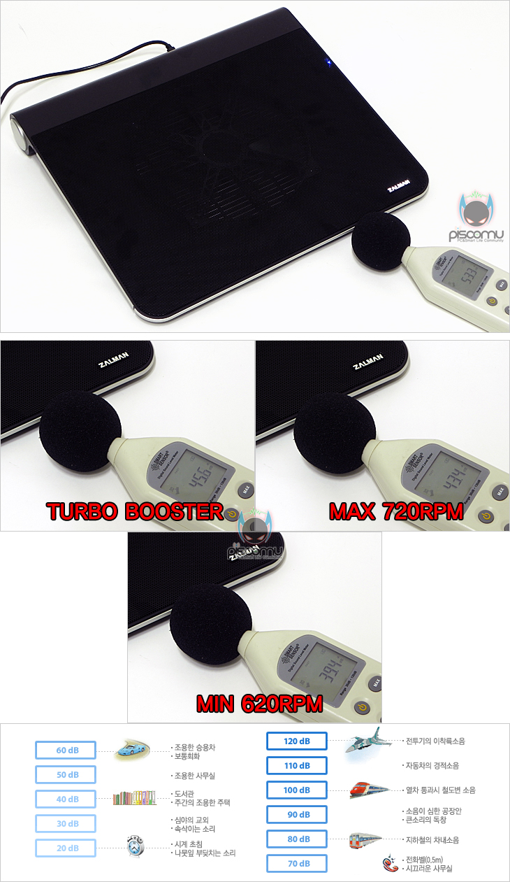 실제, ZM-NC3500/Plus를 사용해 보았습니다. 최대 17인치까지 지원하는 이번 모델에 15.6인치 노트북을 올려놓고, 먼저, 터보 부스터 기능이 있는 기본 모델을 PCMark를 실행해 터보 부스터 사용시와 기본 팬 속도 최대/최저일 때의 노트북 내부 주요 칩셋 온도를 확인해 보았습니다. 확인 결과, 큰 차이는 아니지만, 팬 속도가 높아짐에 따라 1~2°가량의 온도차이가 있음을 확인할 수 있겠습니다. 그리고, 두 모델 모두 동일 팬이기 때문에 기본 팬의 최대/최저 팬 소음과 기본 모델의 터보 부스터 시 팬소음을 측정해 본 결과, 역시 팬 속도에 따라 소음이 반비례하는 결과를 보여줬습니다. 하지만, 전체적으로 팬 소음 모두 30~40db(A) 영역이라 소음은 준수한 편이라 할 수 있겠습니다. 끝으로, Plus 모델 경우 탑재된 스피커를 노트북 자쳬 한 계의 사운드 출력을 해결해주기에는 충분한 걸을 느낄 수 있어서 게임이나 영상 감상 시 사용으로 좋겠습니다. 그리고, 두 모델 모두 4개의 USB 포트를 지원하고 있어 노트북의 부족한 USB 포트를 느끼는 사용자에겐 아주 유용한 지원이 되겠습니다.