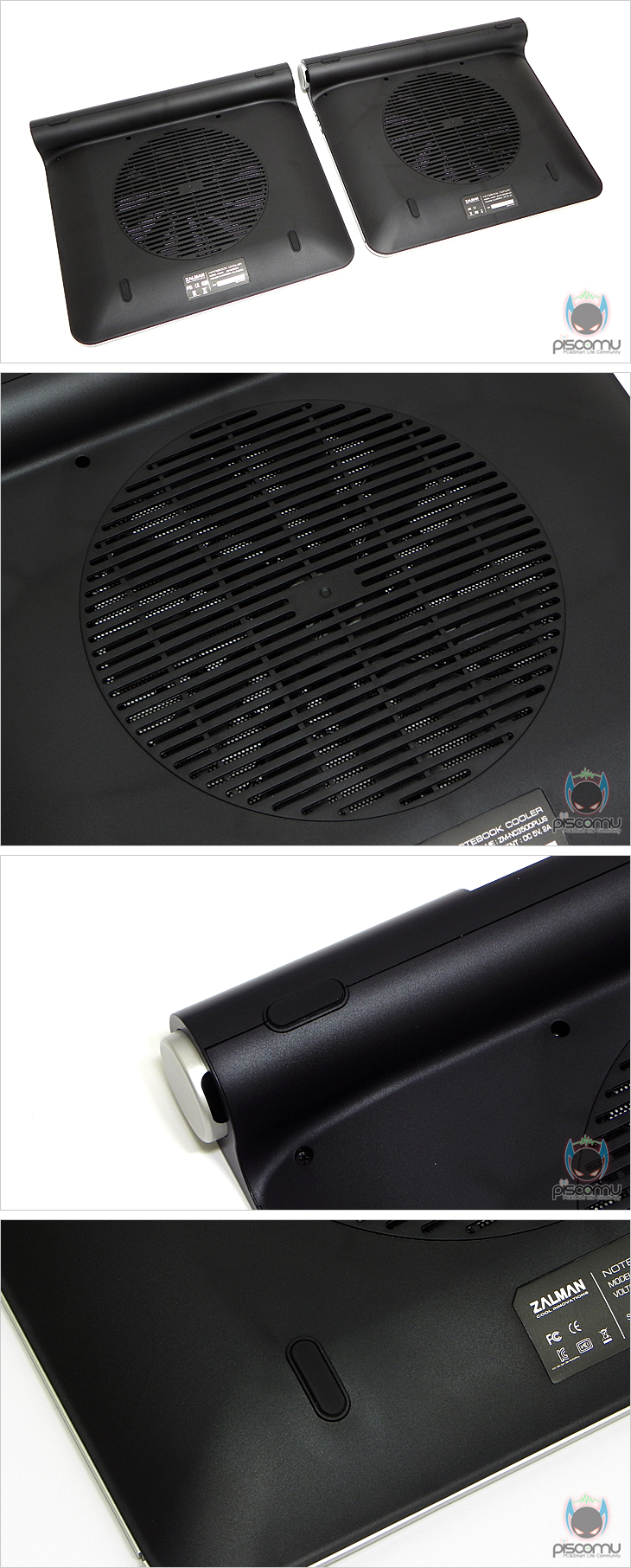 이제, ZM-NC3500/Plus의 외형을 살펴보겠습니다. 두 제품 모두 기본적인 디자인과 생김새는 동일합니다. 노트북 밑면과 맞닿는 쿨러 상위는 일부 앞부분은 제외한 전체 메쉬(타공망) 처리를 해놨으며, 내부에는 대형 220mm 팬이 장착되어 있겠습니다. 또한, 오른쪽 하단에는 제조사 로고가 부착되어 있습니다. 쿨러 전면 역시 두 모델 모두 동일한 구성으로 포트 지원을 갖추고 있습니다. USB 전원 포트를 제외한 일반 USB 포트 총 4개 지원과 왼쪽에는 팬 속도를 조절할 수 있는 팬 컨트롤러가 배치되어 있겠습니다. 또한, 별도의 5V 전원 단자로 지원 합니다. 그리고, 쿨러 측면 역시 두 모델 동일한 디자인으로 별도의 높낮이 지원 없이 앞부분이 원형 디자인으로 약 10°가량 올라가 경사형태를 이루고 있겠습니다. 쿨러 밑면 역시 두 모델 동일한 형태로 외부 공기 유입을 위해 중앙 에어홀 처리와 함께 미끄럼 방지를 위한 전후 각 모서리 부근에 고무패드를 기본 부착 해놨습니다. 이제, ZM-NC3500/Plus 두 모델의 차이점을 확인해 보겠습니다. 기본 모델(ZM-NC3500)경우 우측에 터보 부스터 기능이 있는데, 이 기능은 앞서 말했듯이 전면에 있는 팬 컨트롤러 외에 추가로 팬 속도를 더 끌어올려 작동시켜주는 기능이 되겠습니다. 왼쪽부터 터보 부스터 램프, On/Off 버튼, 터보 부스터 버튼 순으로 배치가 되어 있습니다. 이와 달리 Plus 모델은 우측에 스피커 지원으로 인한 볼륨 조절 버튼과 음소거 버튼, 그리고 On/Off 버튼, 램프가 배치되어 있습니다. 또한, 앞부분 측면 원형 부분에는 홀처리가 되어 있는데, 내부에서 보면 양쪽에 2개의 스피커가 배치된 것을 확인할 수 있겠습니다. 즉, 2채널 스피커를 갖춘 것입니다.