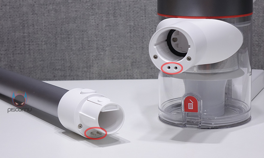 그리고, 각 청소도구들을 V9P 몸체와 연결하는 방식도 기존 V9와 동일합니다. 각 연결부위마다 아랫쪽에 2개의 구멍과 접지가 있는데, 이에 맞춰서 연결하면 쉽게 연결이 되구요. 분리도 윗쪽에 동그란 부분은 누르면 쉽게 분리할 수 있습니다. 기본 청소용 노즐부터 틈새/와이드 브러쉬, 진드기 노즐 도구까지 모두 같은 방식으로 몸체와 연결해주면 됩니다.