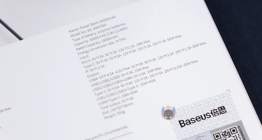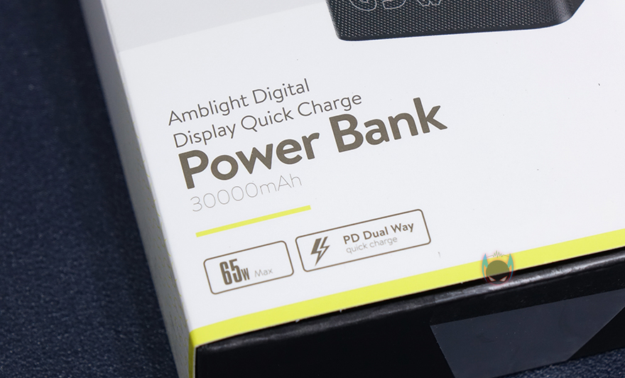 Baseus(베이스어스) 대부분의 제품들은 제품박스 전면에 제품 이미지를 담고 있죠. 이 제품 역시 전면에 제품 이미지를 담고 있습니다. 단순이 이미지만 참고했을 때는 전형적인 보조배터리 디자인을 가지고 있죠. 그리고, 모델명을 확인할 수 있는데, 역시 가장 눈에 들어오는 문구는 Amblight 디지털 디스플레이입니다. 물론, 30,000mAh 배터리 용량과 최대 65W 충전, 듀얼 PD 지원도 확인할 수 있죠.