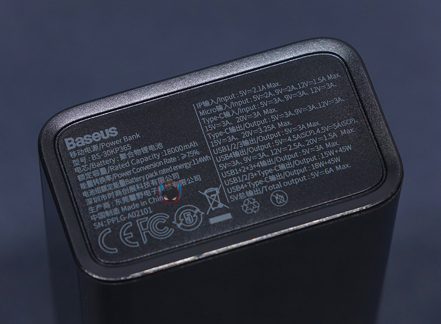 포트는 당연히 보조배터리 전면에 배치되어 있는데, 총 7개 구성으로 USB 타입A 포트들은 모두 출력포트이며, USB 타입C 포트는 입출력 모두 지원하고, 마이크로 5핀과 라이트닝 포트는 입력포트입니다. 요즘은 마이크로 5핀과 라이트닝 포트 사용 비중이 많이 줄어들었기 때문에, 사실상 보조배터리 충전은 USB 타입C 포트로 한다고 보면 되겠죠. 그래서, USB 타입C포트로 보조배터리를 충전할 때는 최대 60W까지 지원을 해주고 있습니다. 출력 같은경우에는 USB 1,2,3번 포트는 모두 최대 15W까지 출력할 수 있으며, 4번 포트가 고속 충전포트로 최대 65W까지 지원하고 있죠. 그리고, 총 출력포트가 5개이기 때문에, 다양하게 활용할 수 있는데, USB 1,2,3,4번 포트 모두 함께 사용했을 시에는 최대 15W로 지원하며, 1,2,3번과 타입C 포트로 사용했을 시에는 15W+45W로 지원, USB 4번과 타입C 포트를 함께 사용했을 시에는 18W와 45W로 각각 작동됩니다. 물론, 이런 출력에 관한 정보는 보조배터리 밑바닥부분에도 표기되어 있으니, 사용할 때마다 수시로 확인을 하고 사용하면 됩니다.